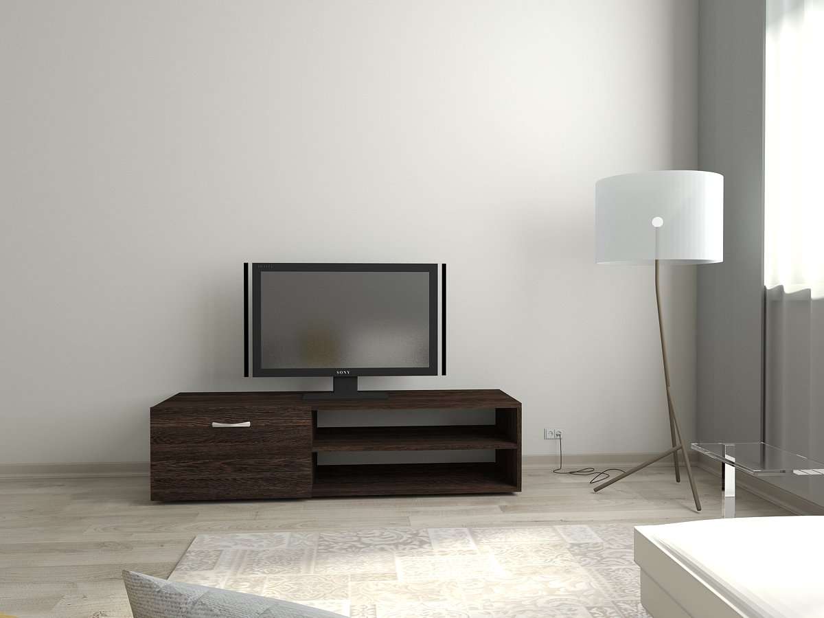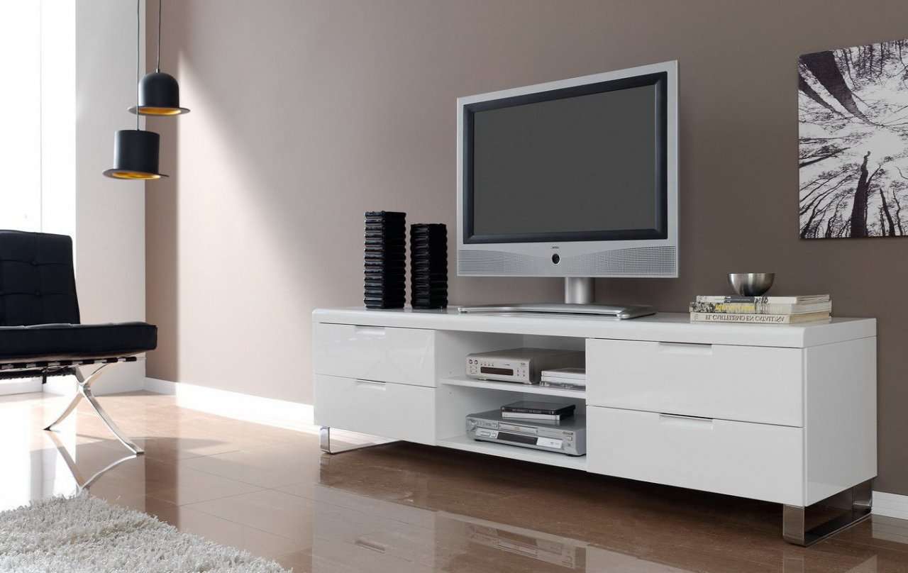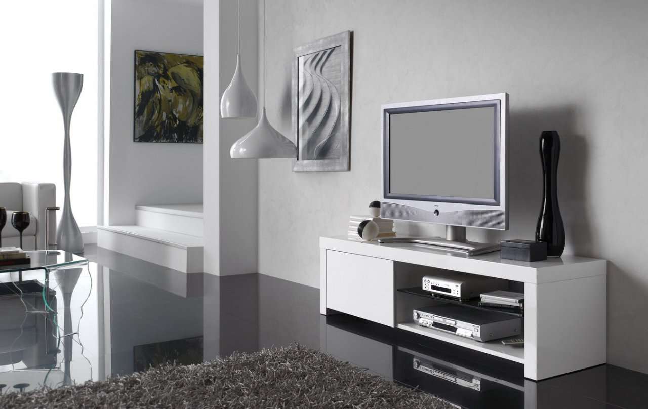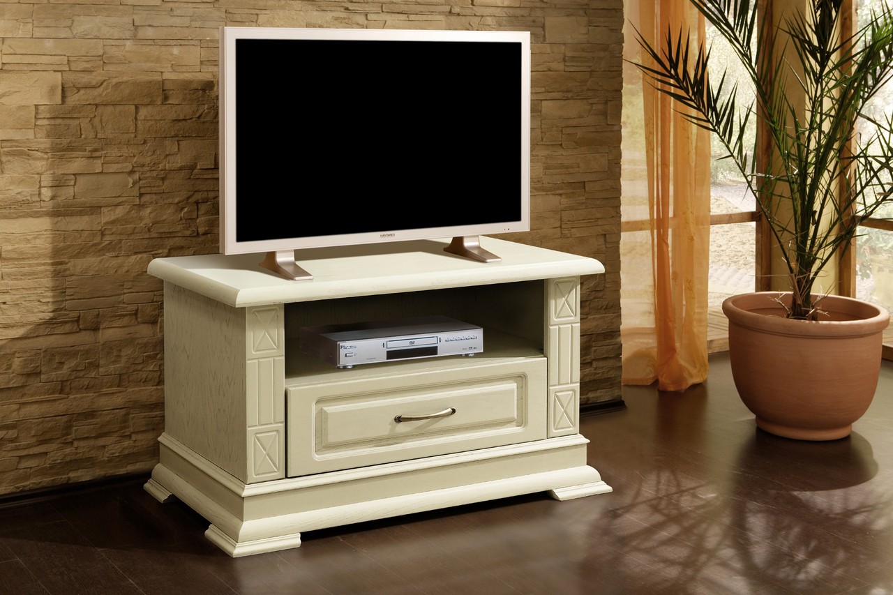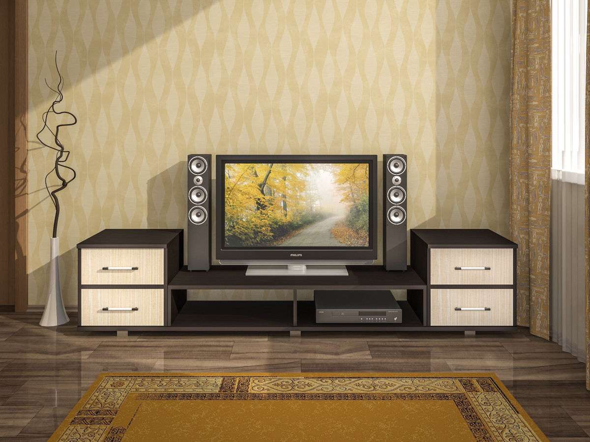 Sob o armário de TV, há um gabinete bastante amplo, caracterizado por uma pequena altura. De ano para ano, as televisões estão se tornando mais finas, além de mudar a aparência e as mesas de cabeceira. Sua instalação traz muitos pontos positivos:
