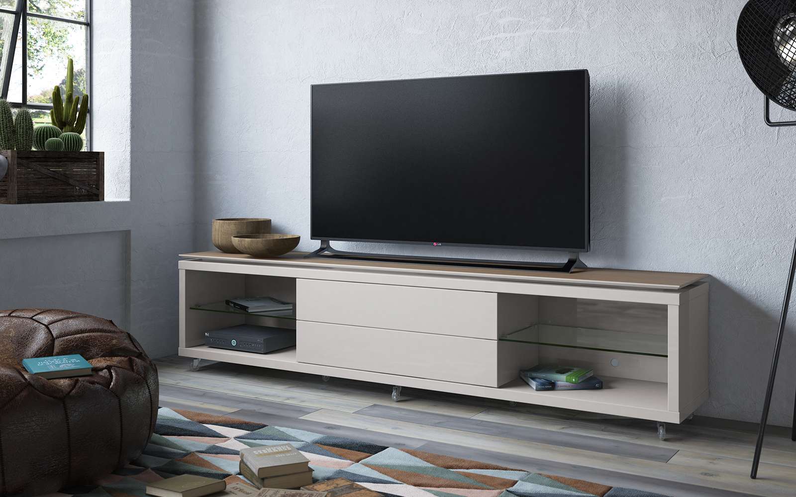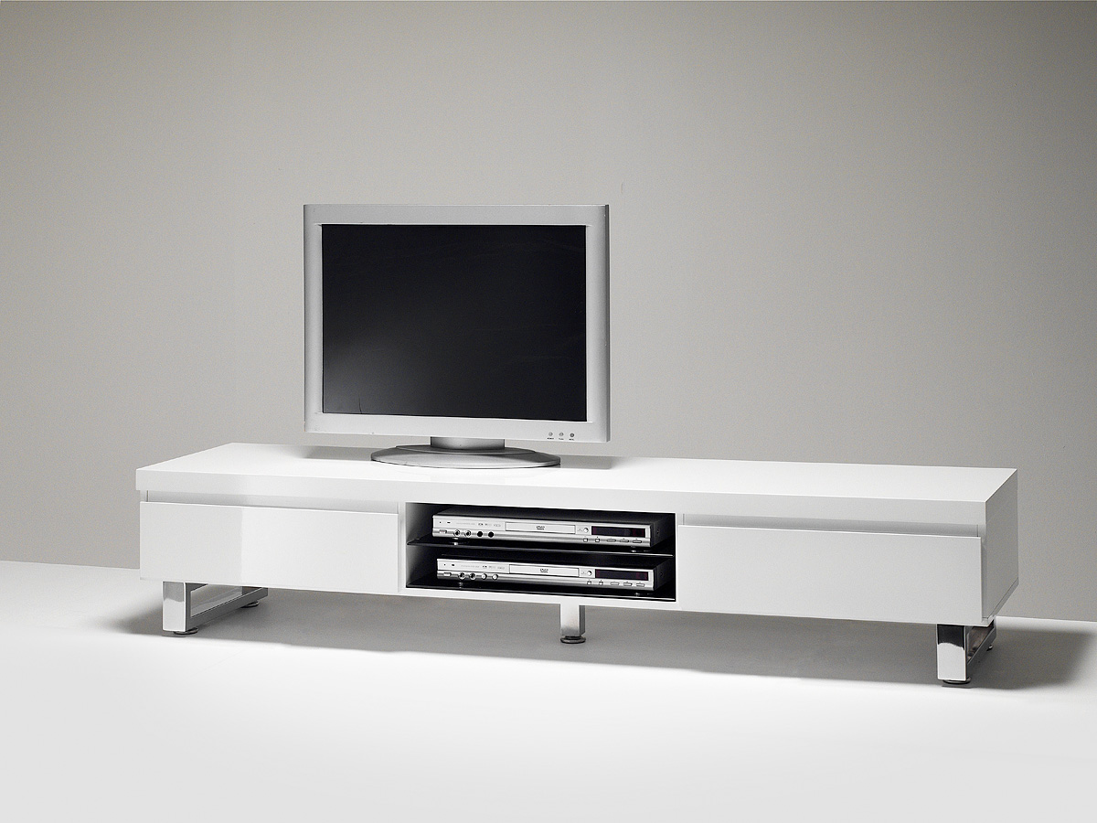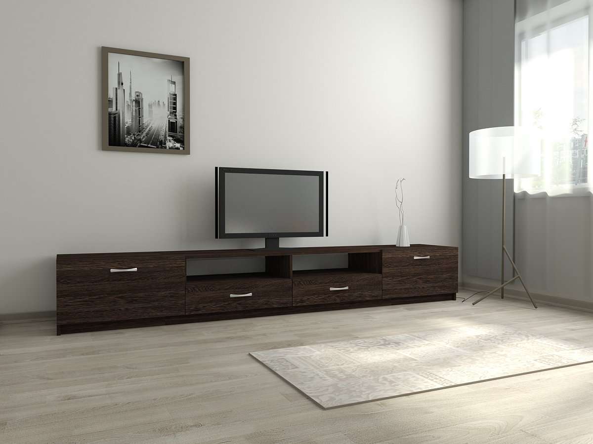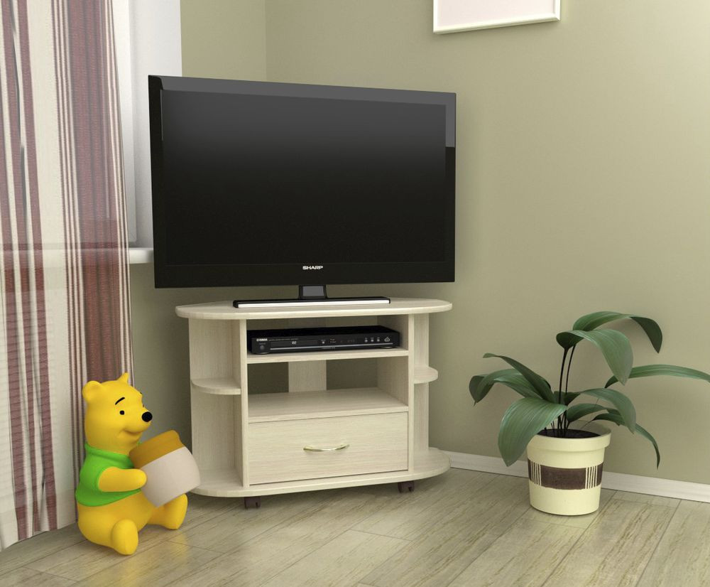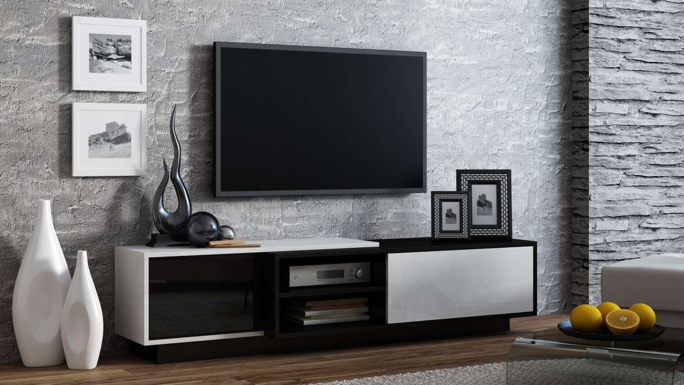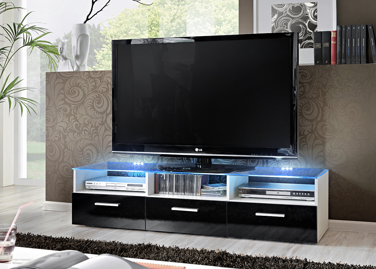 Sob o armário de TV, há um gabinete bastante amplo, caracterizado por uma pequena altura. De ano para ano, as televisões estão se tornando mais finas, além de mudar a aparência e as mesas de cabeceira. Sua instalação traz muitos pontos positivos: