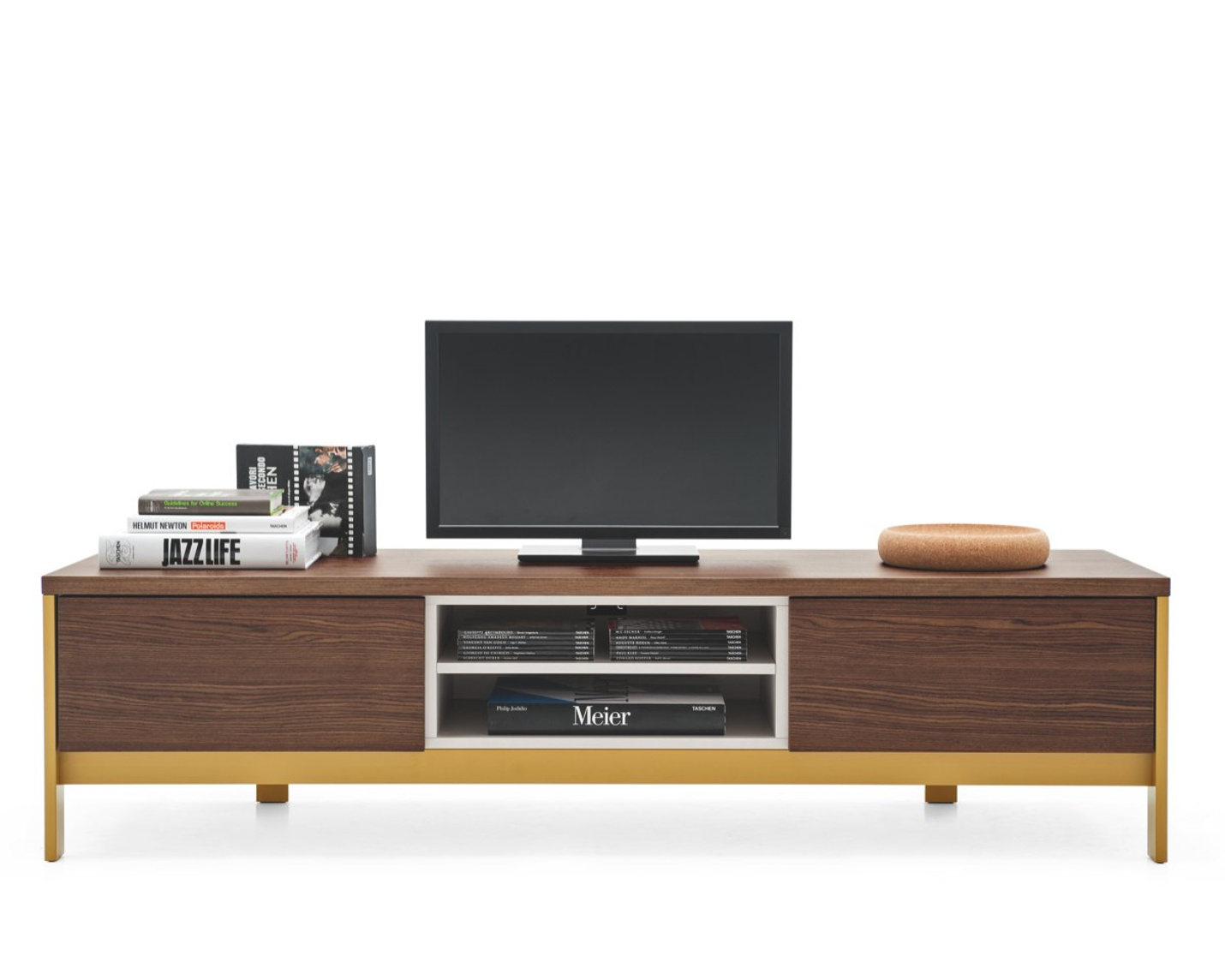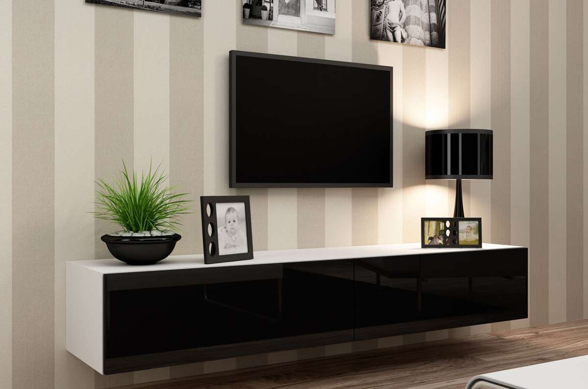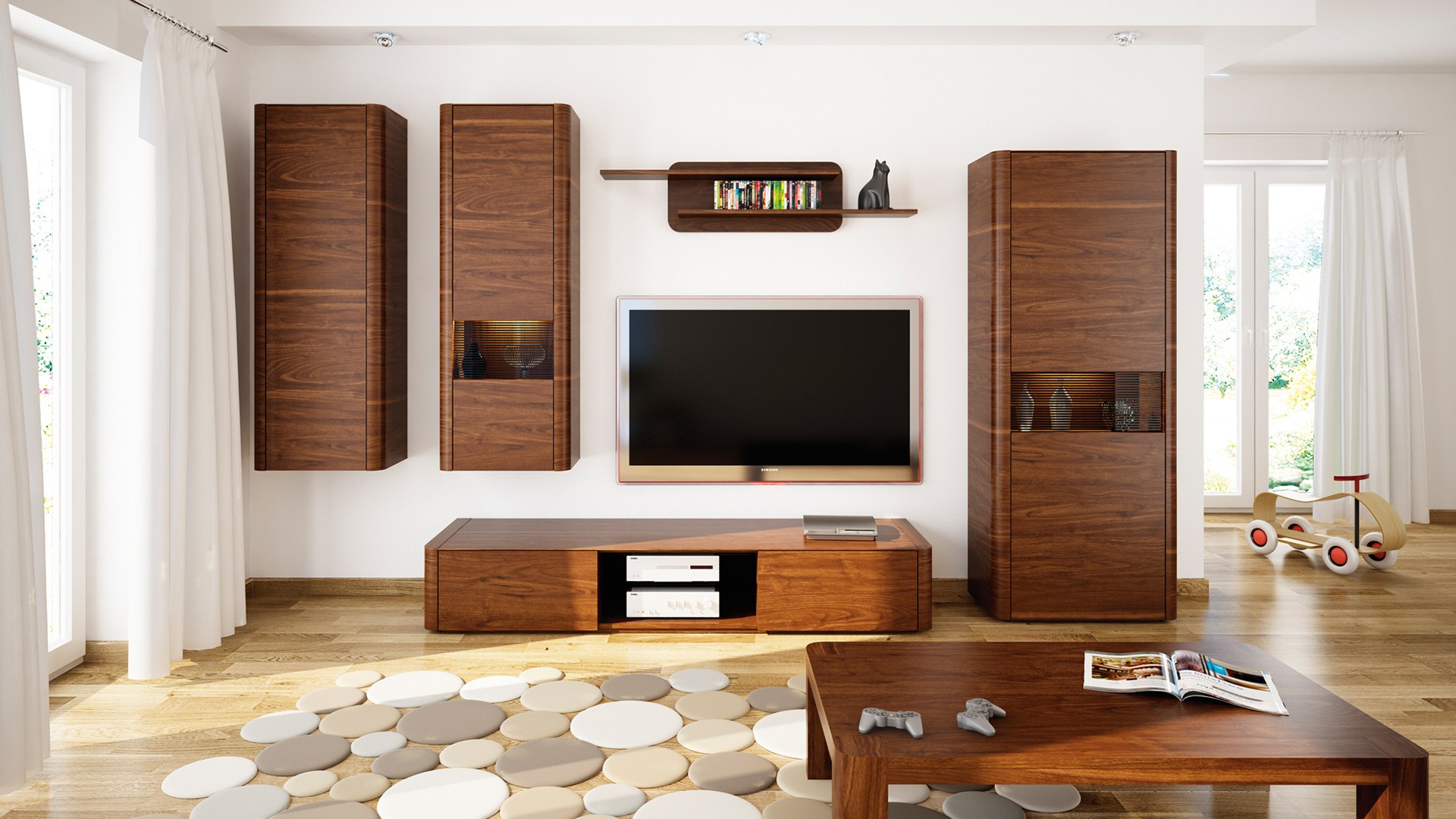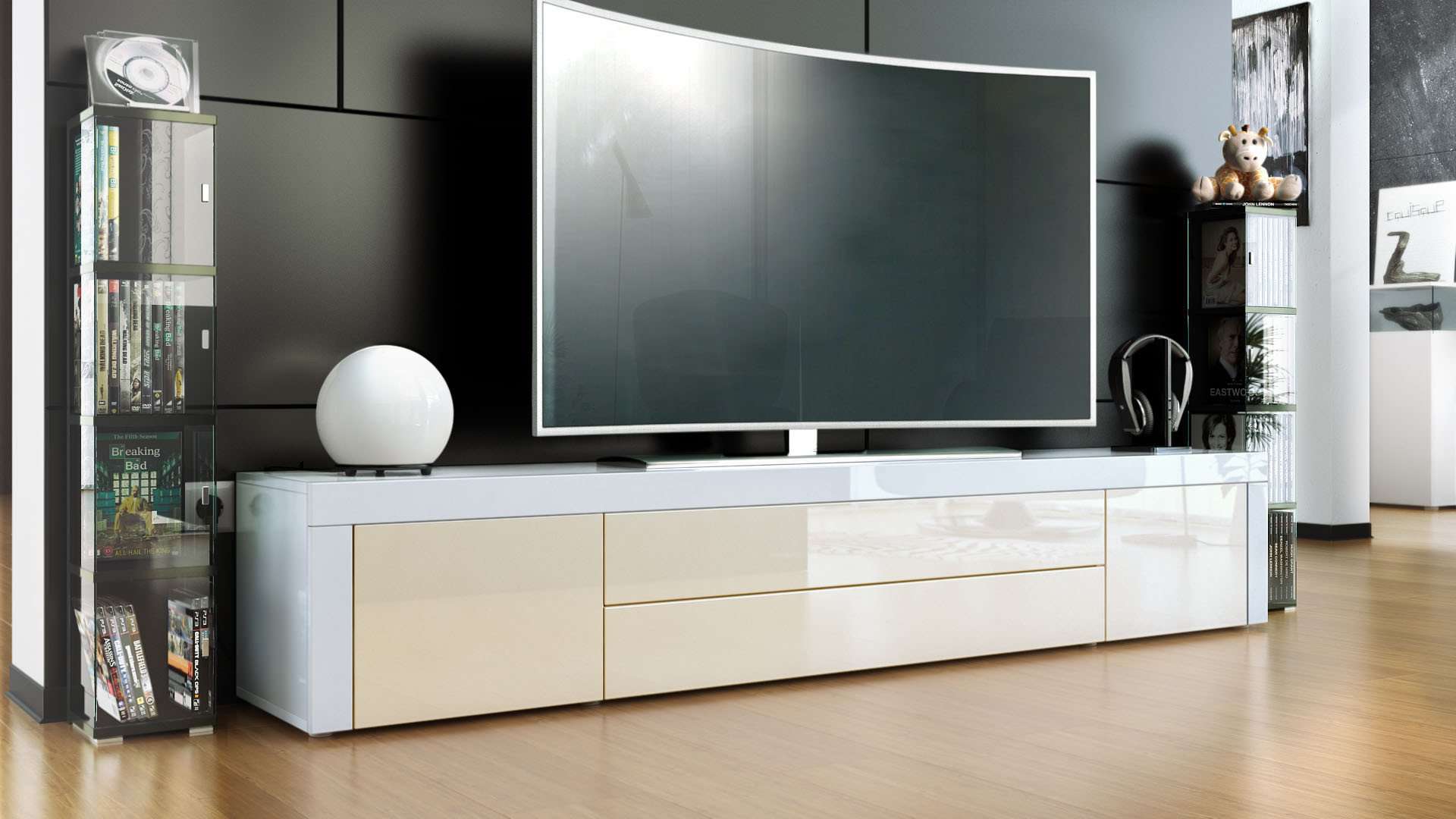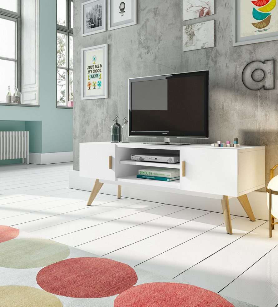 Sob o armário de TV, há um gabinete bastante amplo, caracterizado por uma pequena altura. De ano para ano, as televisões estão se tornando mais finas, além de mudar a aparência e as mesas de cabeceira. Sua instalação traz muitos pontos positivos: