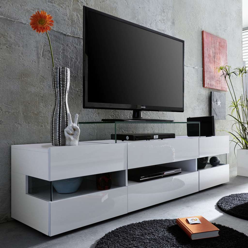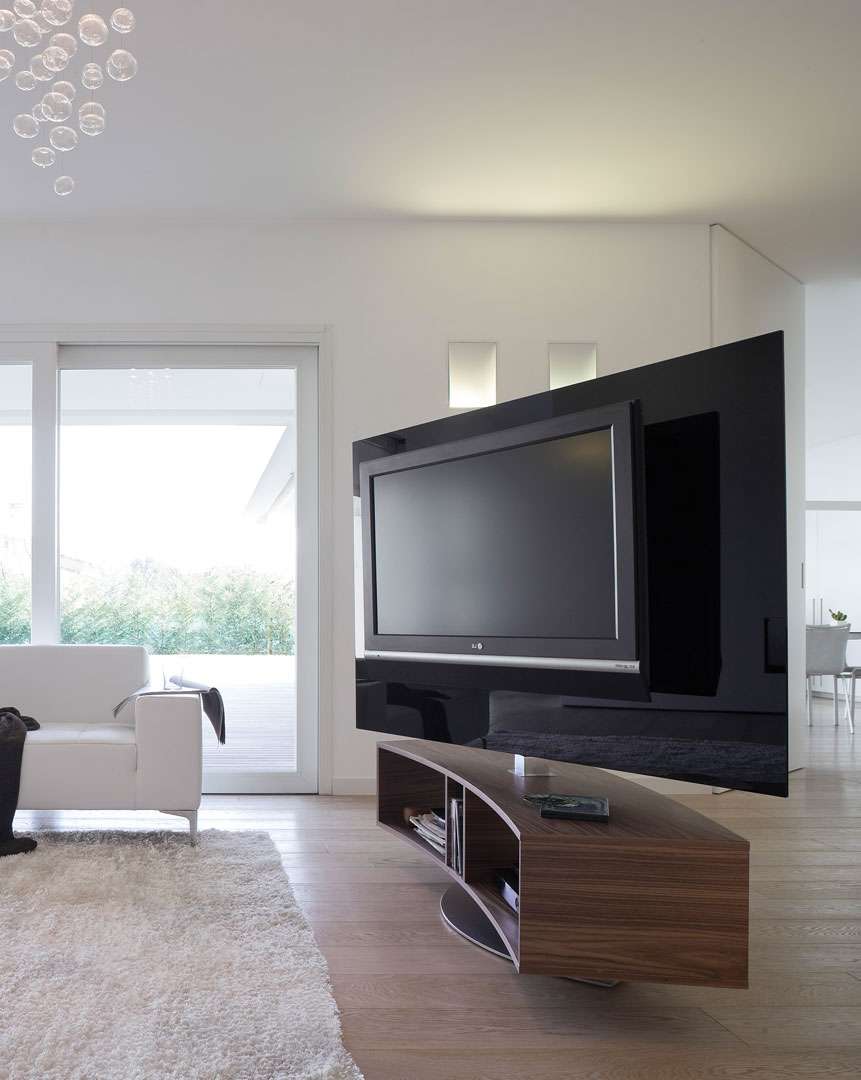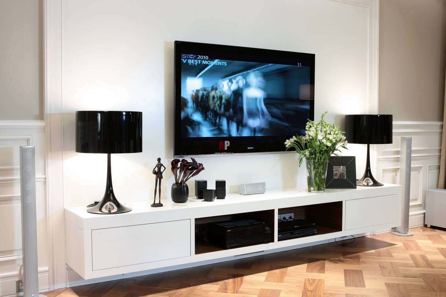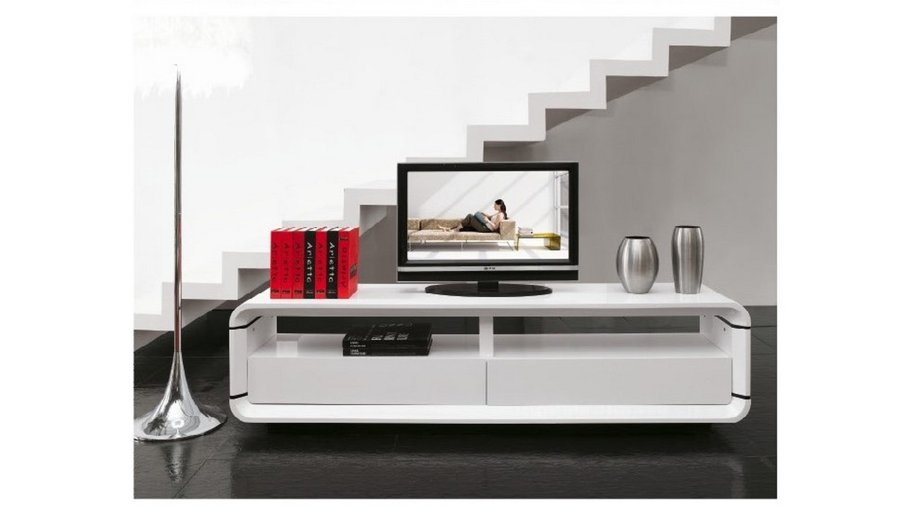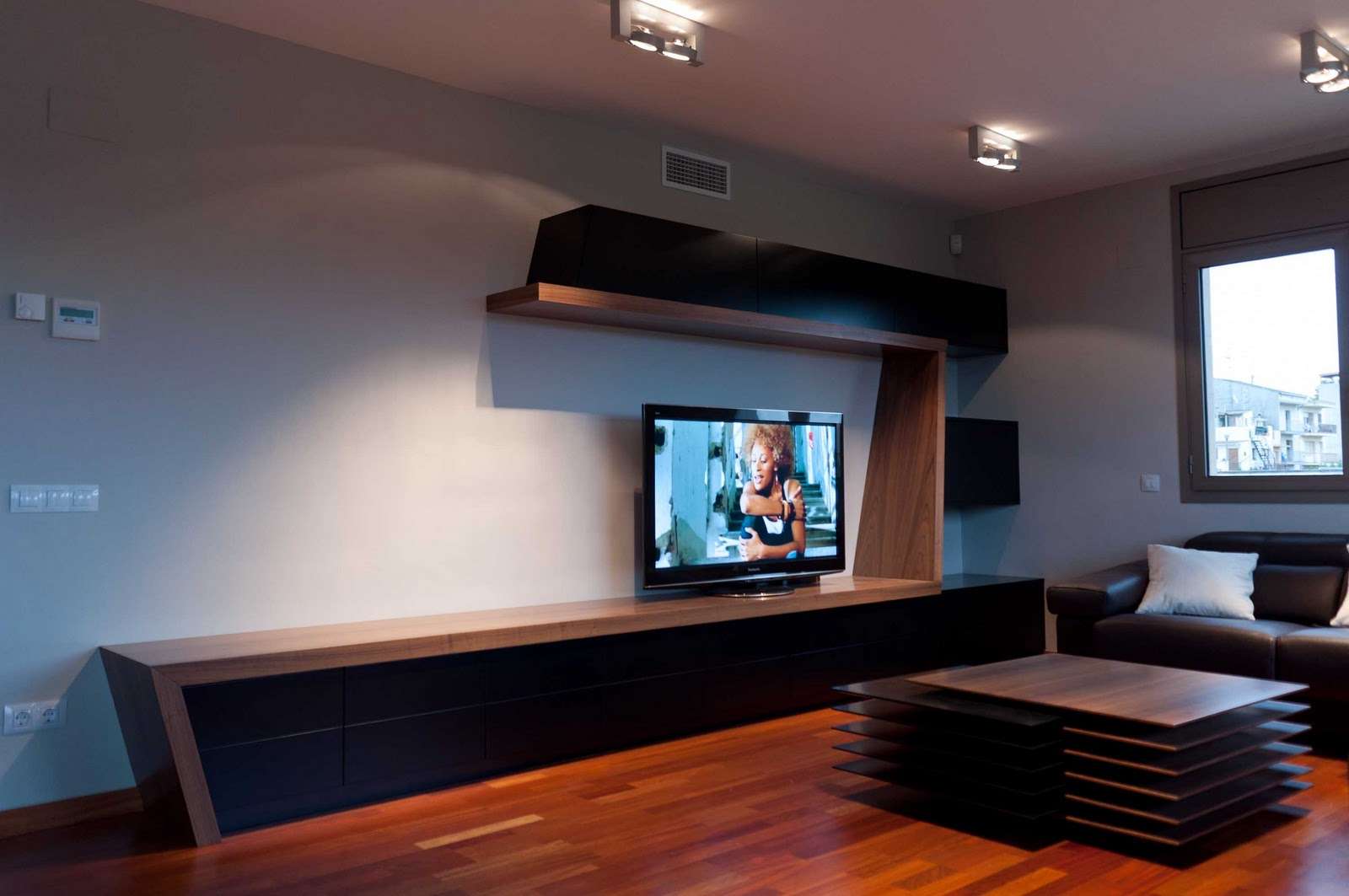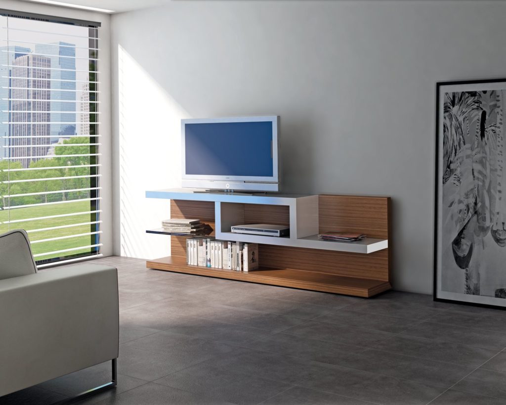 Mobiliário moderno sob a tela ajuda é uma decisão rentável e pensativa, organizando sabiamente a sala e liberando espaço. A abundância de formas e materiais aumentará o efeito do grande ecrã e tornará a ver televisão com a família e os amigos mais agradável.