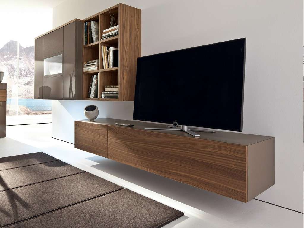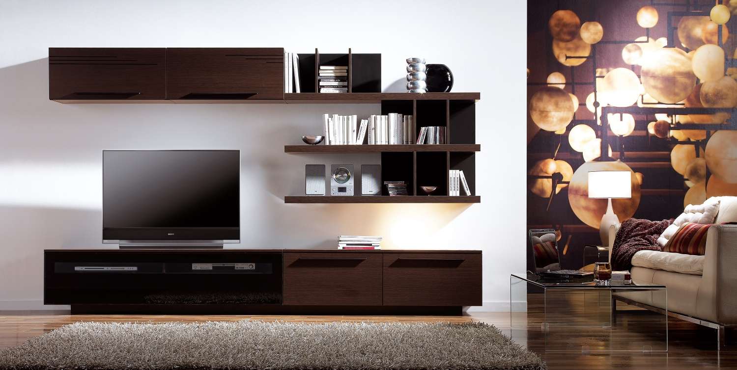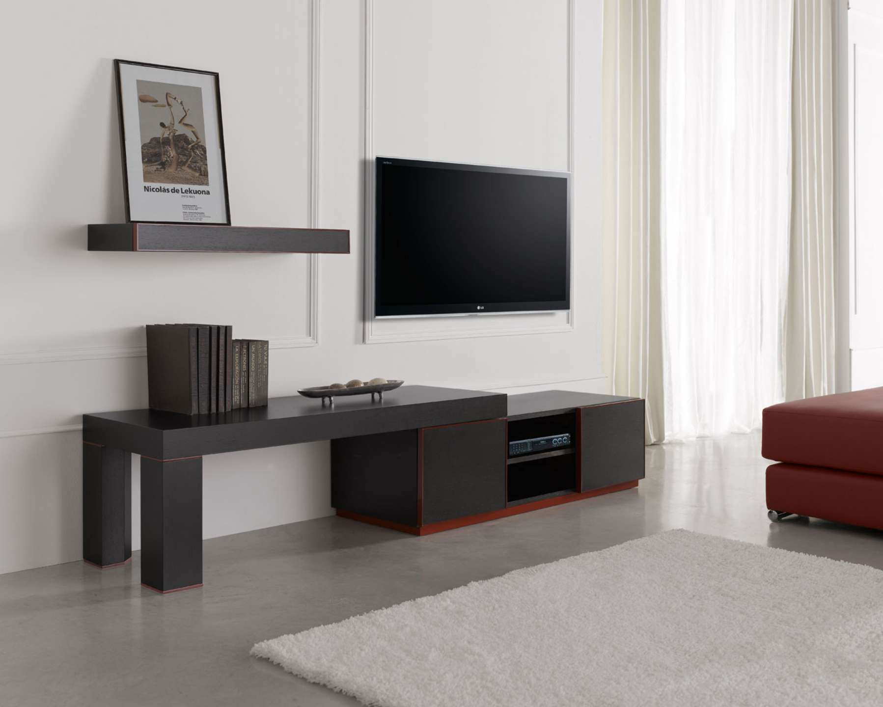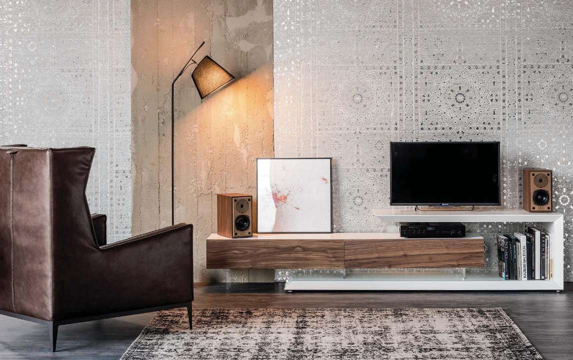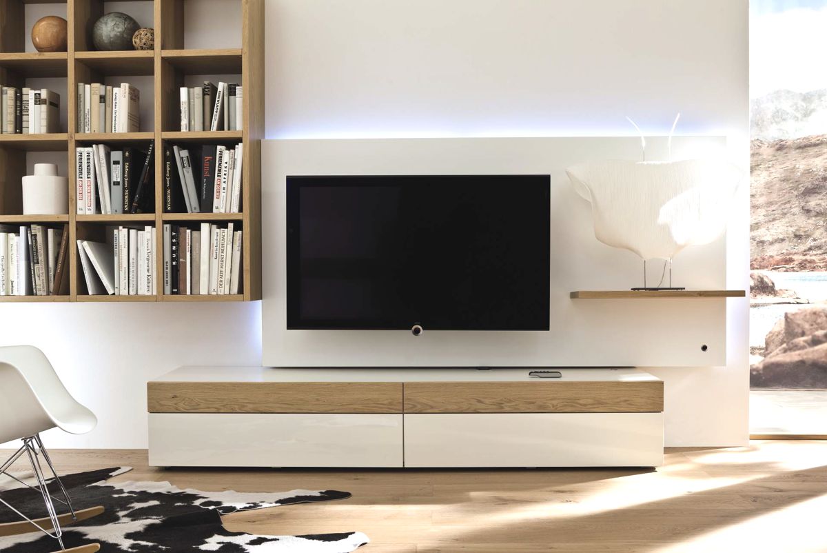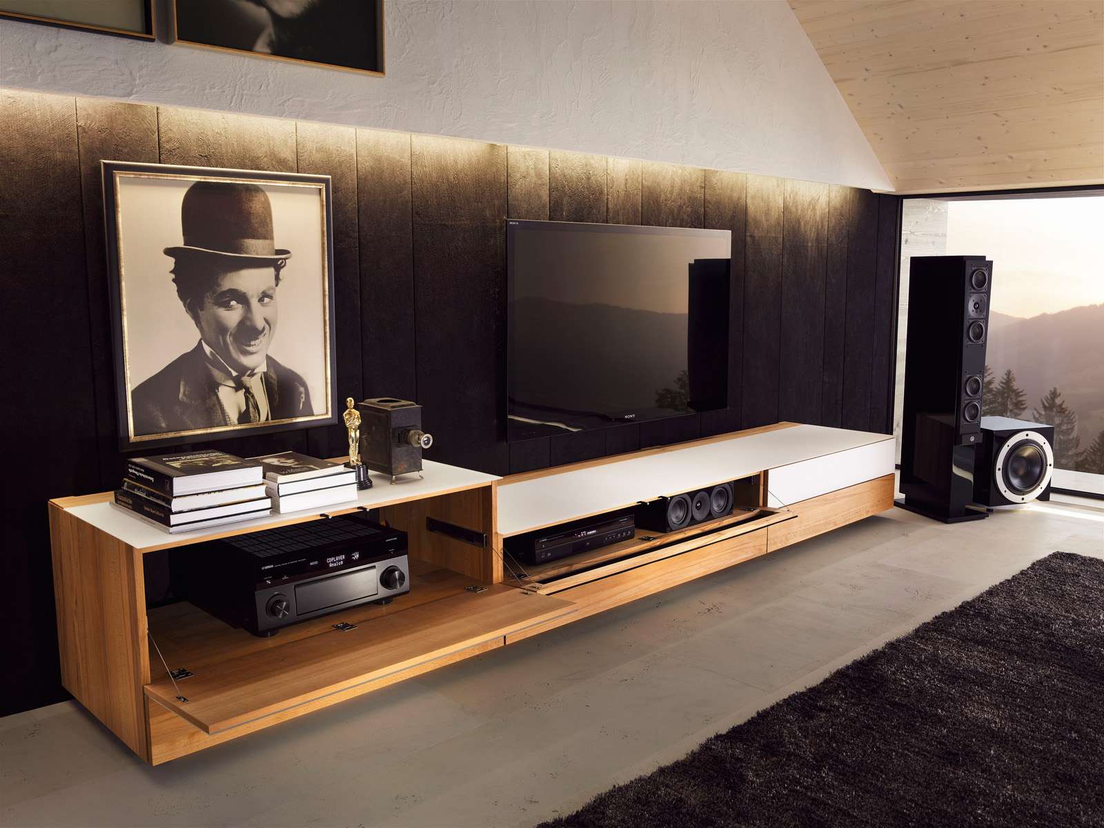 Mobiliário moderno sob a tela ajuda é uma decisão rentável e pensativa, organizando sabiamente a sala e liberando espaço. A abundância de formas e materiais aumentará o efeito do grande ecrã e tornará a ver televisão com a família e os amigos mais agradável.
