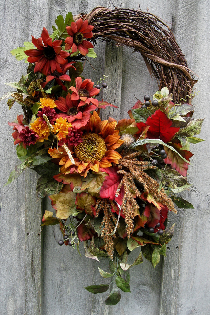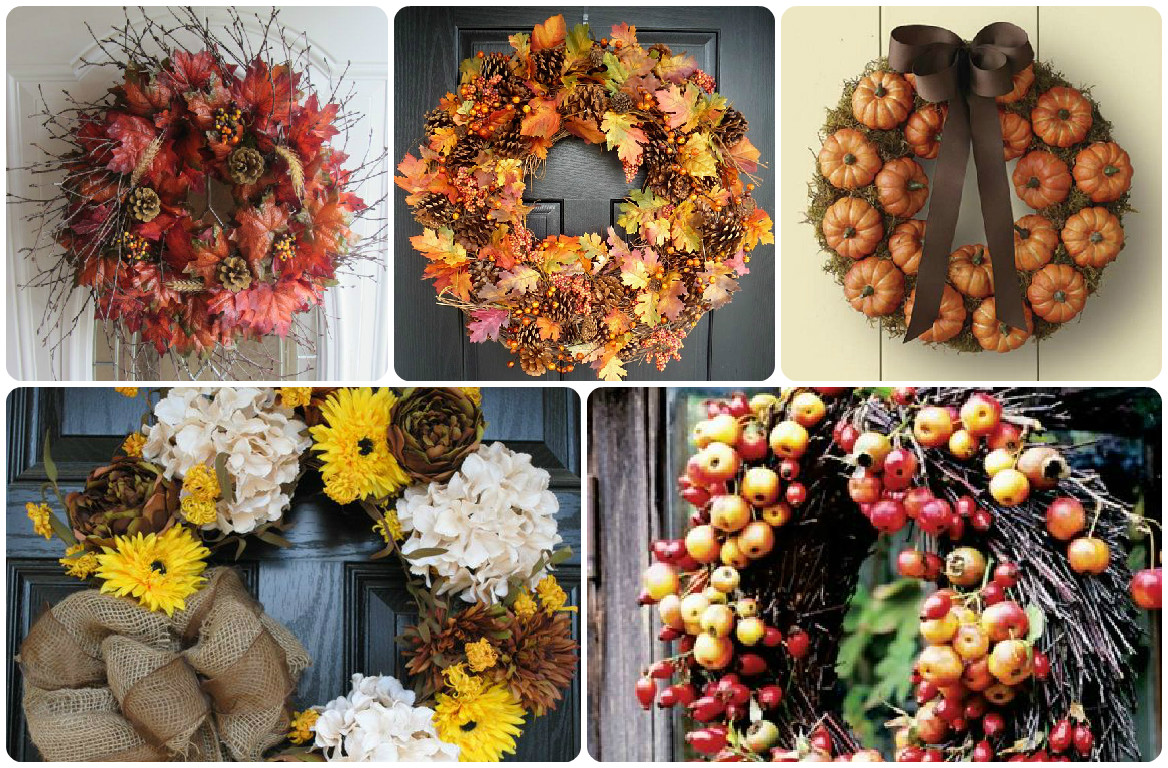 Grinaldas de outono para decoração tecem suas folhas caídas, alternando com ásteres, pervinca e raminhos de cinza de montanha. Uma composição multicor brilhante com um ponto brilhante se destacará no espaço de entrada.
