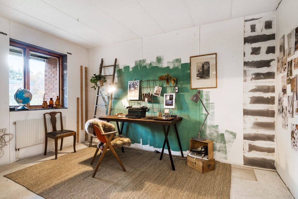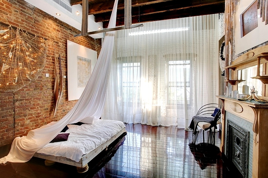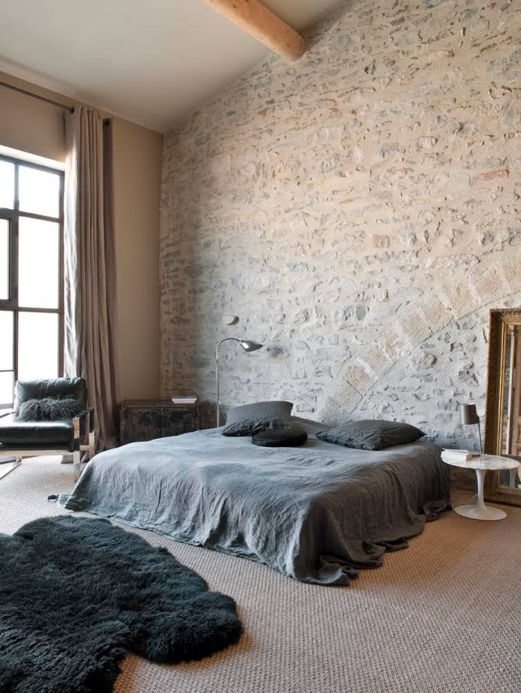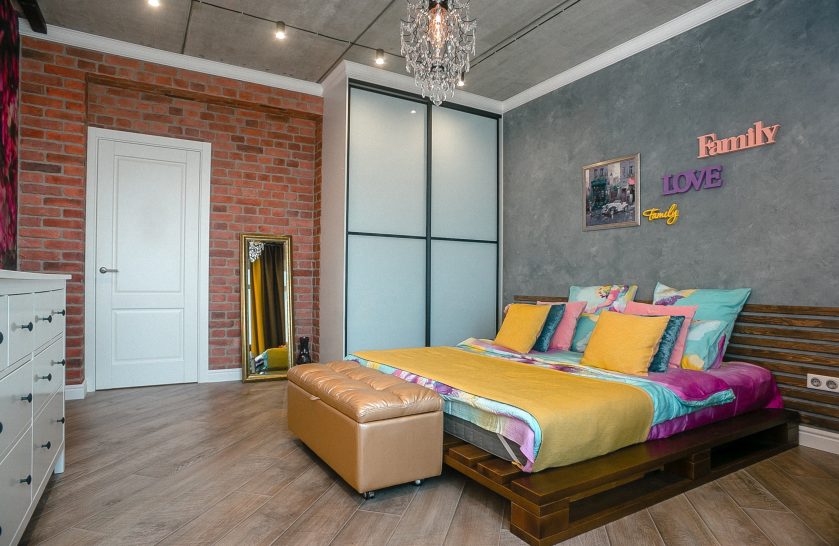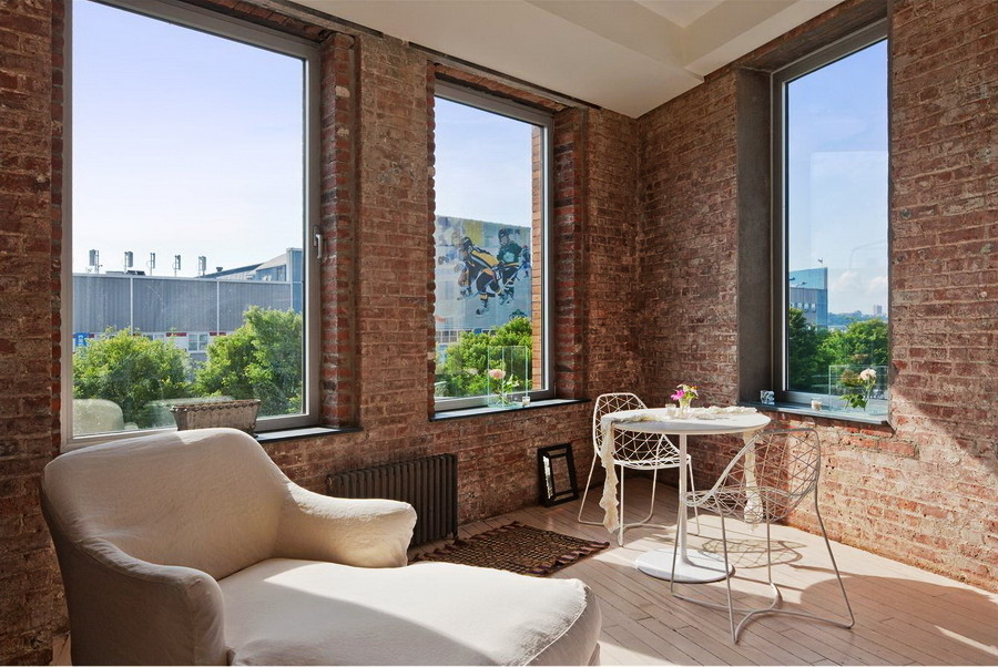 Dentro, apenas o necessário mobília. A falta de decoração foi preenchida com obras de arte com direitos autorais. Concreto cinza, tijolo ou as paredes forradas de tábuas serviram de base (estande de exposição) sobre o qual os objetos de arte pareciam bons. E grandes janelas juntas com tetos altos fizeram o quarto bastante luminoso e espaçoso.