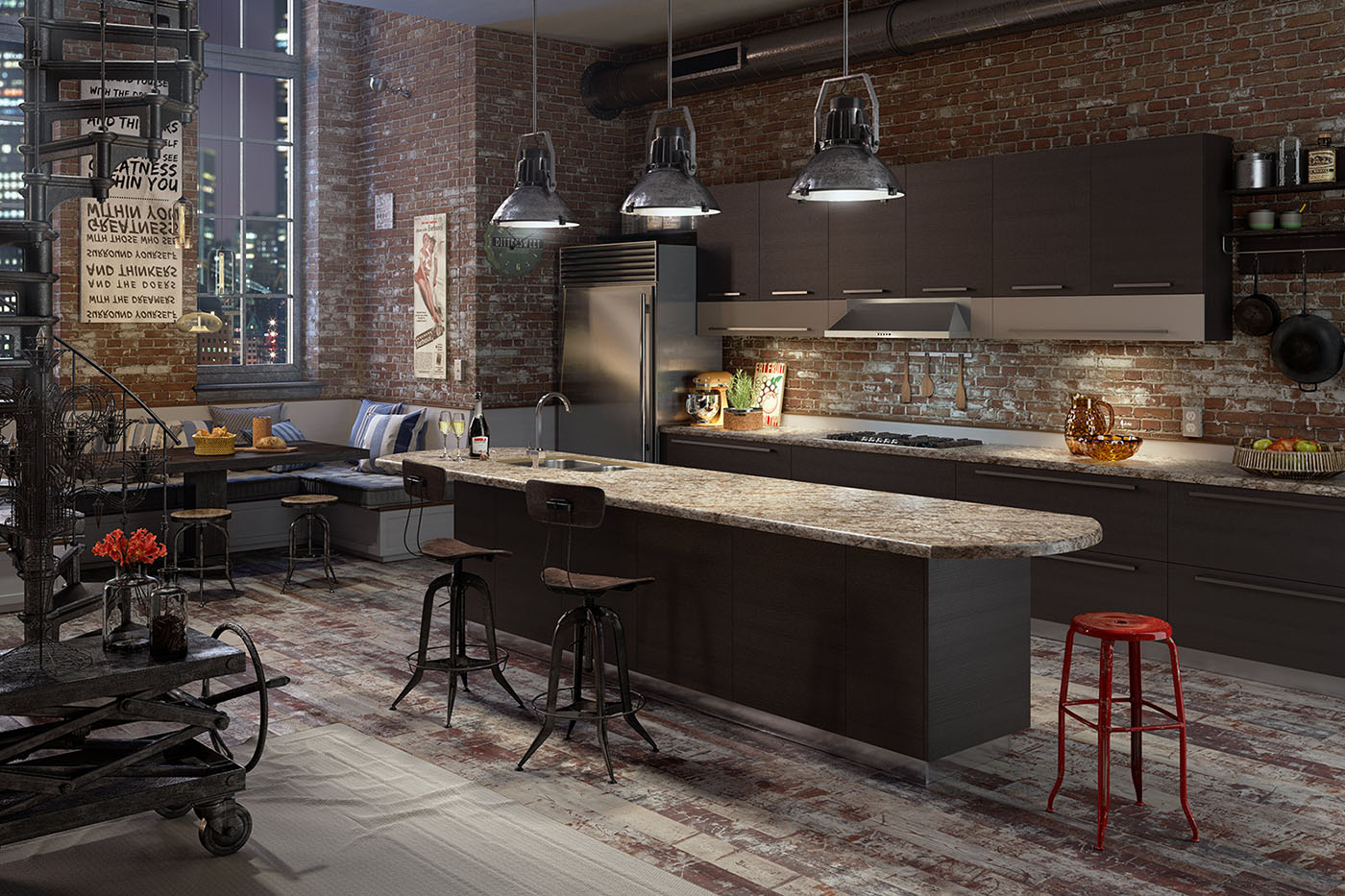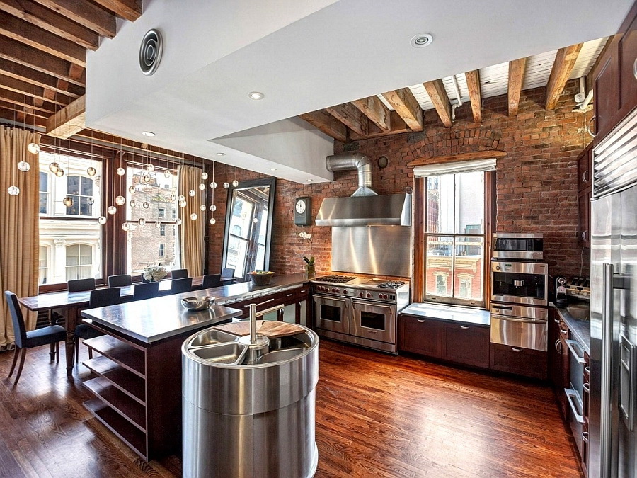 A cozinha em estilo loft se distingue pela decoração de parede áspera, móveis ergonômicos, eletrodomésticos e layout. Muitas vezes esta não é uma sala separada, mas uma das áreas funcionais combinadas em um estúdio. Para a delimitação desta zona são utilizados: