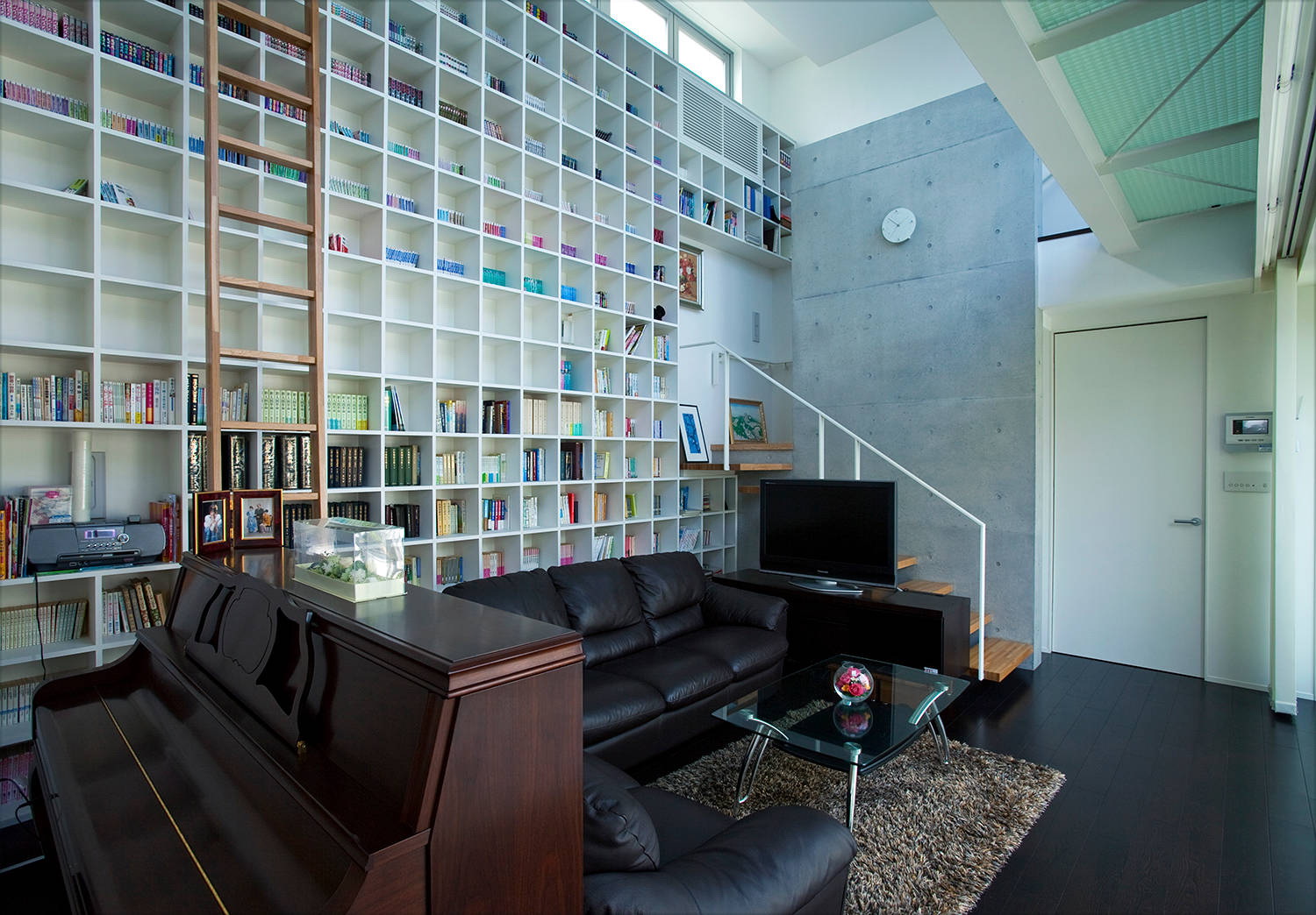 Na sala há prateleiras abertas de madeira e metal, pedestais volumosos, armários, poltronas e penduradas prateleiras.