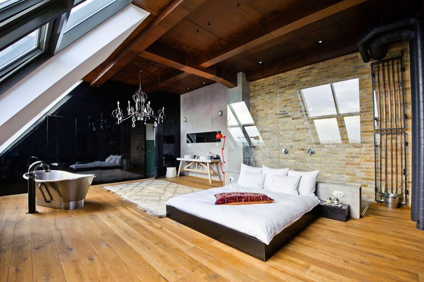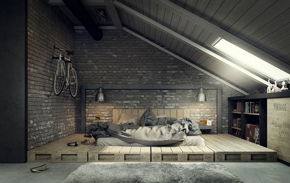 A estética industrial é particularmente relevante na decoração do sótão. A sala sob o telhado de um prédio de vários andares sob o loft atrairá jovens e pessoas criativas.