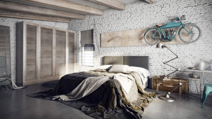 As paredes do quarto com interior moderno em loft devem ser desiguais e cobertas com tinta branca. Isso irá expandir visualmente o espaço e torná-lo mais brilhante.