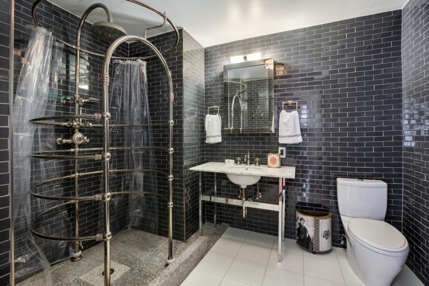 Se a sala tem tetos altos, então nos banheiros vale a pena montar os painéis e baixar o teto. Deve ser feito para que o quarto não se assemelhe a um poço em forma. O concreto cinza ou tijolo solto parecerá organicamente. Piso de cerâmica deve ser usado. telha um design que se assemelha mosaico, pedra ou tábuas.