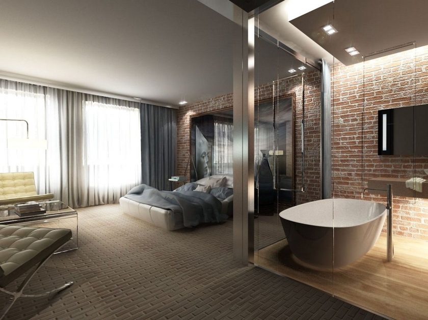 Embora não seja costume dividir os lofts em salas separadas, essa “regra” não se aplica a banheiros e os banheiros quartos Muitas vezes estes quartos estão fechados com partições de materiais diferentes.A localização mais conveniente é o banheiro e banheiro perto do quarto ou zonas recreação.