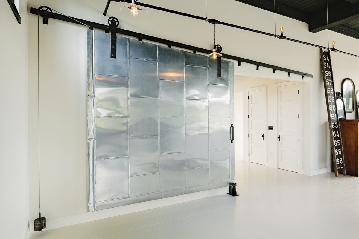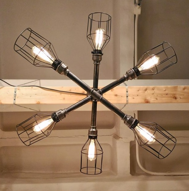 Lustres suspensos em correntes de metal com altura ajustável são utilizados como uma das principais fontes de luz. Eles podem ser fixados ao teto ou vigas e ajustar a altura.
