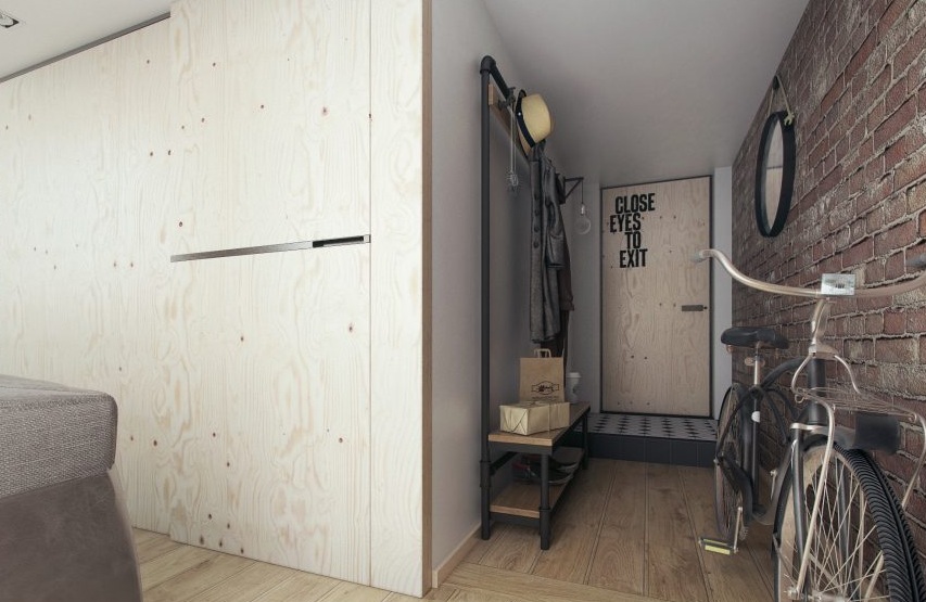 O corredor deve ser feito em tons claros. As paredes da sala não estão alinhadas, mas deixadas texturizadas. Eles podem ser pintados se a superfície for revestida de tijolos ou revestida com azulejos feitos para assentamento ou concreto. O piso do corredor pode ser de madeira, com autonivelamento ou coberto com laminado.