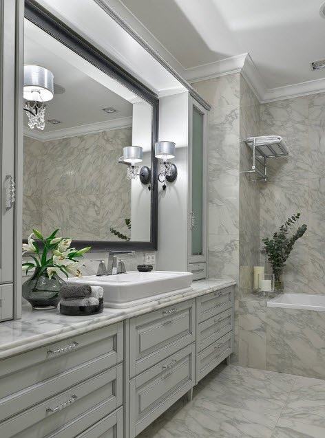 Pendure um belo lustre no teto e, em vez de uma tela de espelho retangular entediante, decore a parede com um espelho em uma moldura forjada ou de madeira.