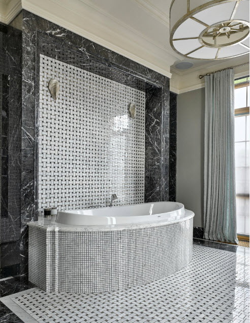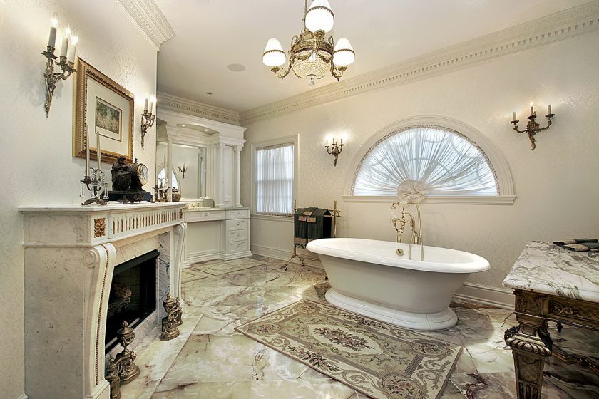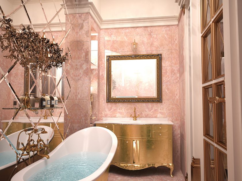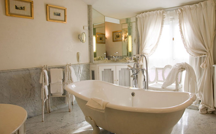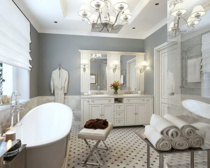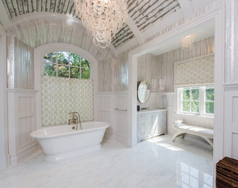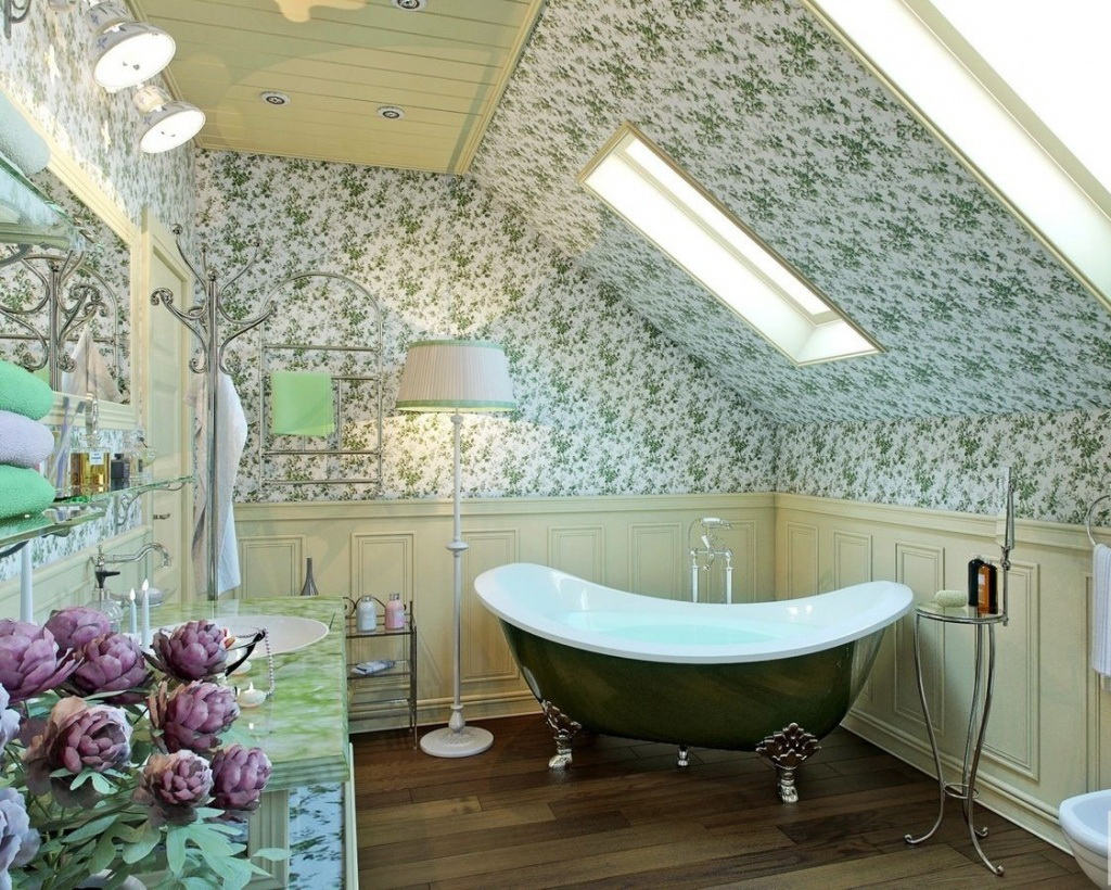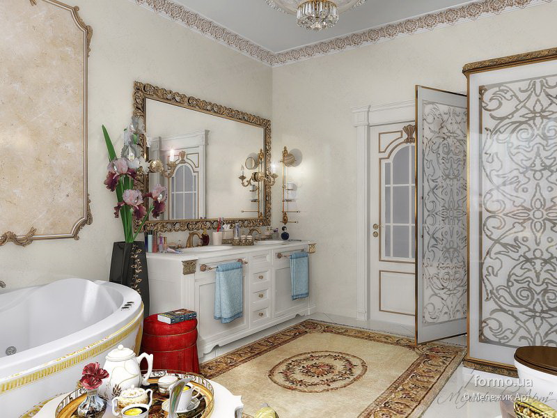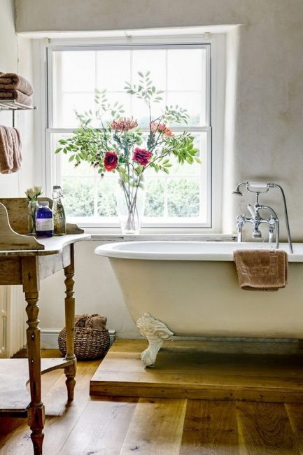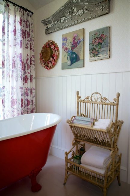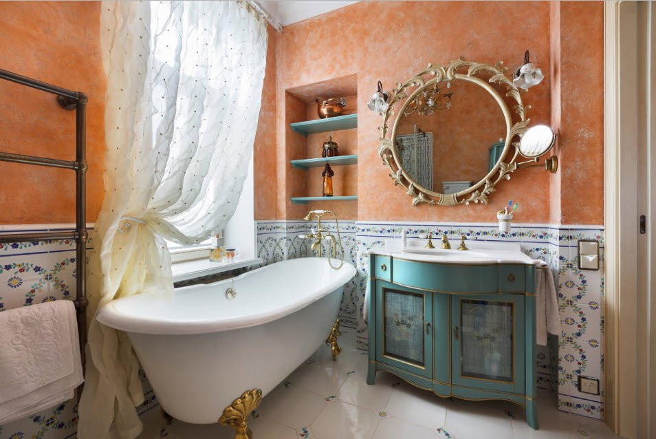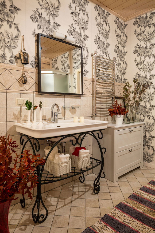 Mas o foco principal na sala é, naturalmente, colocado no próprio banheiro. Tem uma forma alta, extravagante e oval. Elemento obrigatório nele são pernas intrincadas, encaracoladas e forjadas. Tomar tratamentos de água em tal “beleza” é um verdadeiro relaxamento.