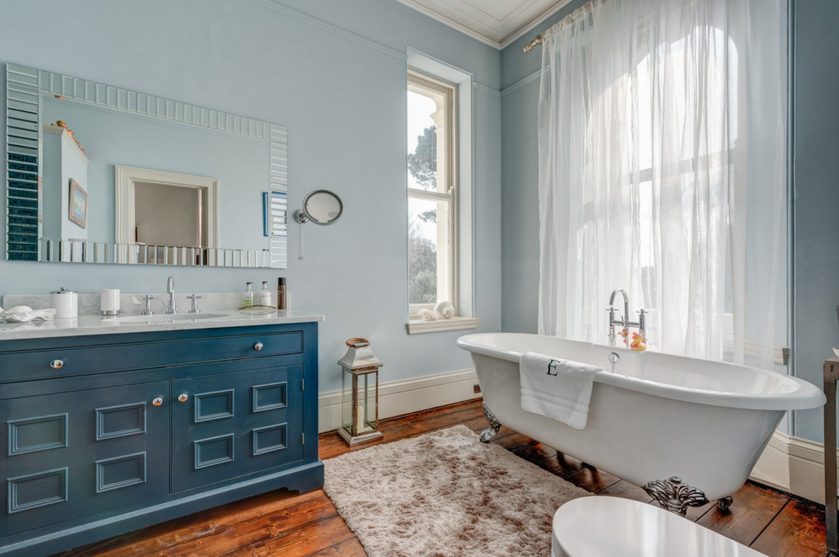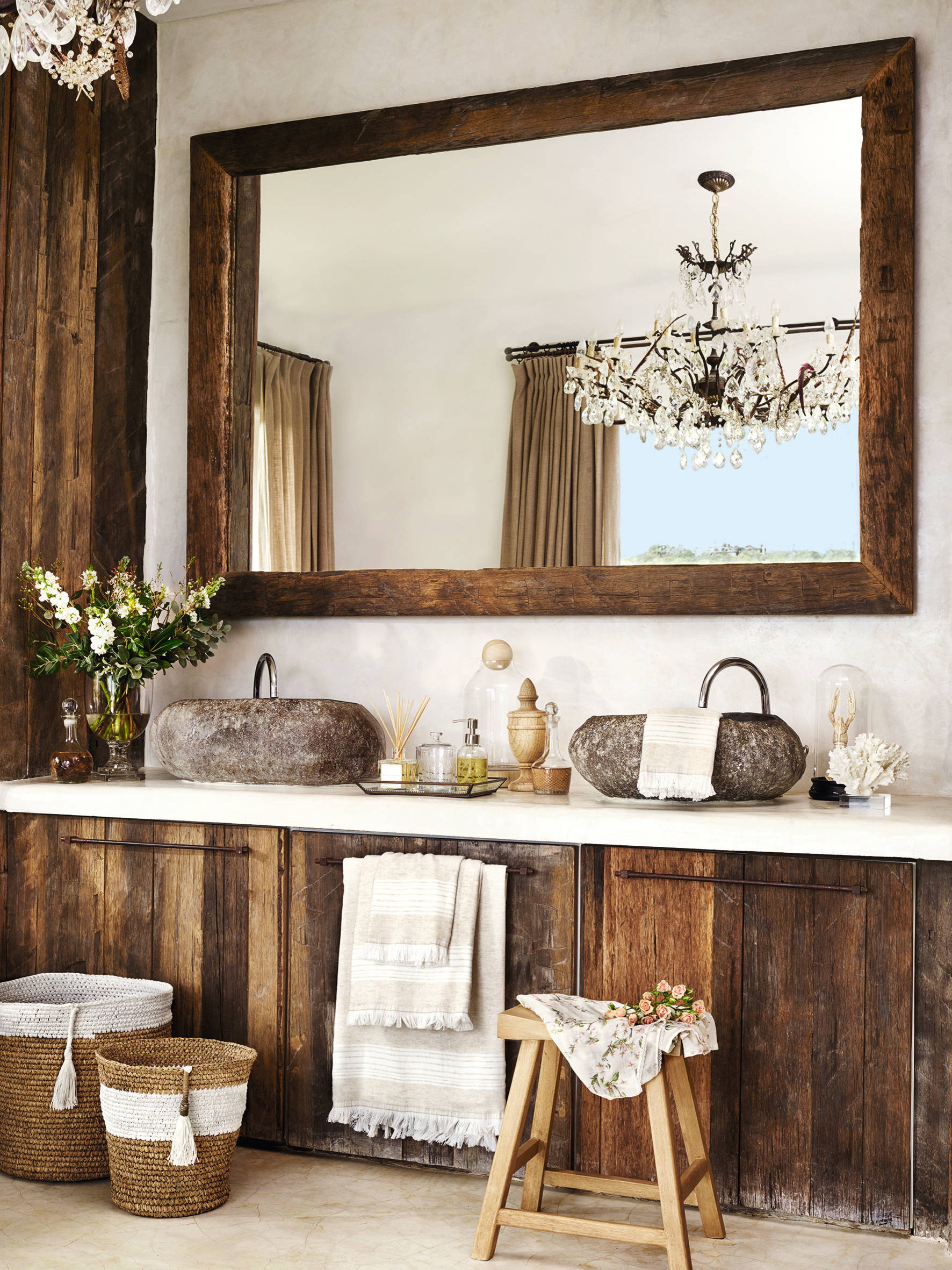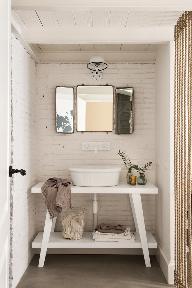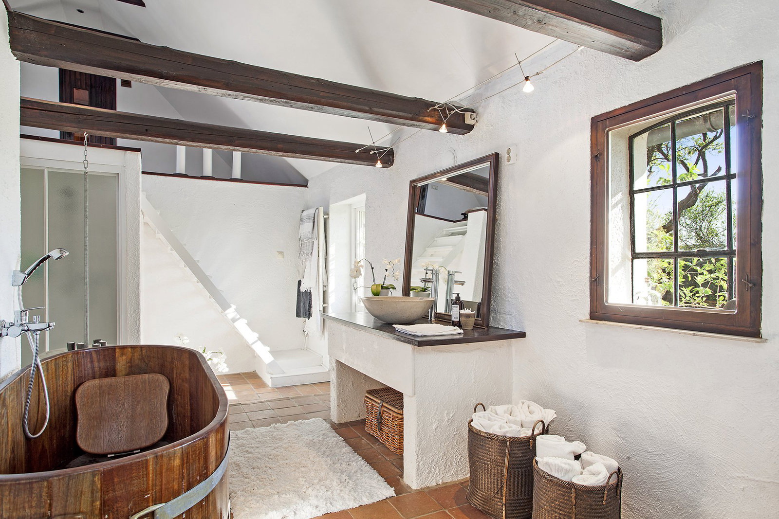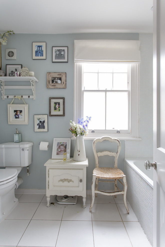 Além de azulejos e madeira no chão do banheiro, você pode colocar pedra natural ou cortiça. Ambas as opções se sentem bem no estilo da Provence.