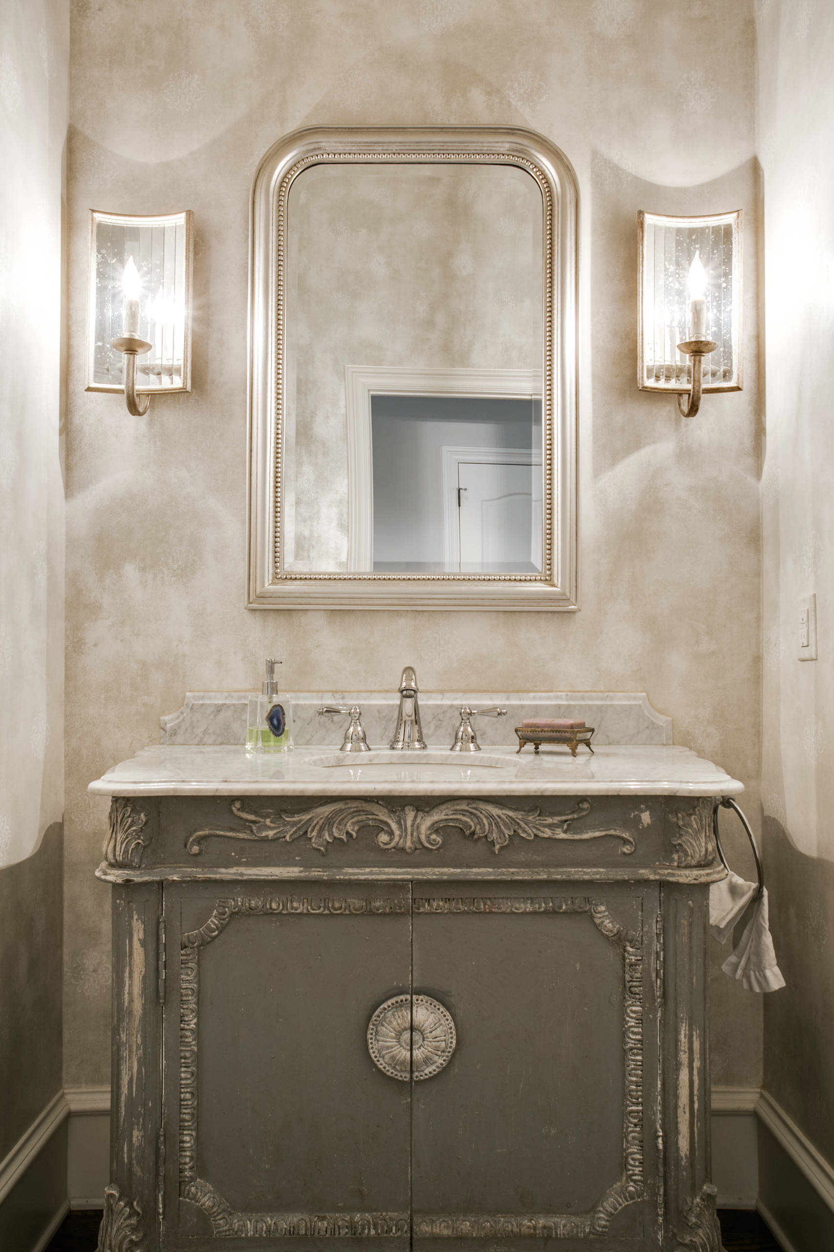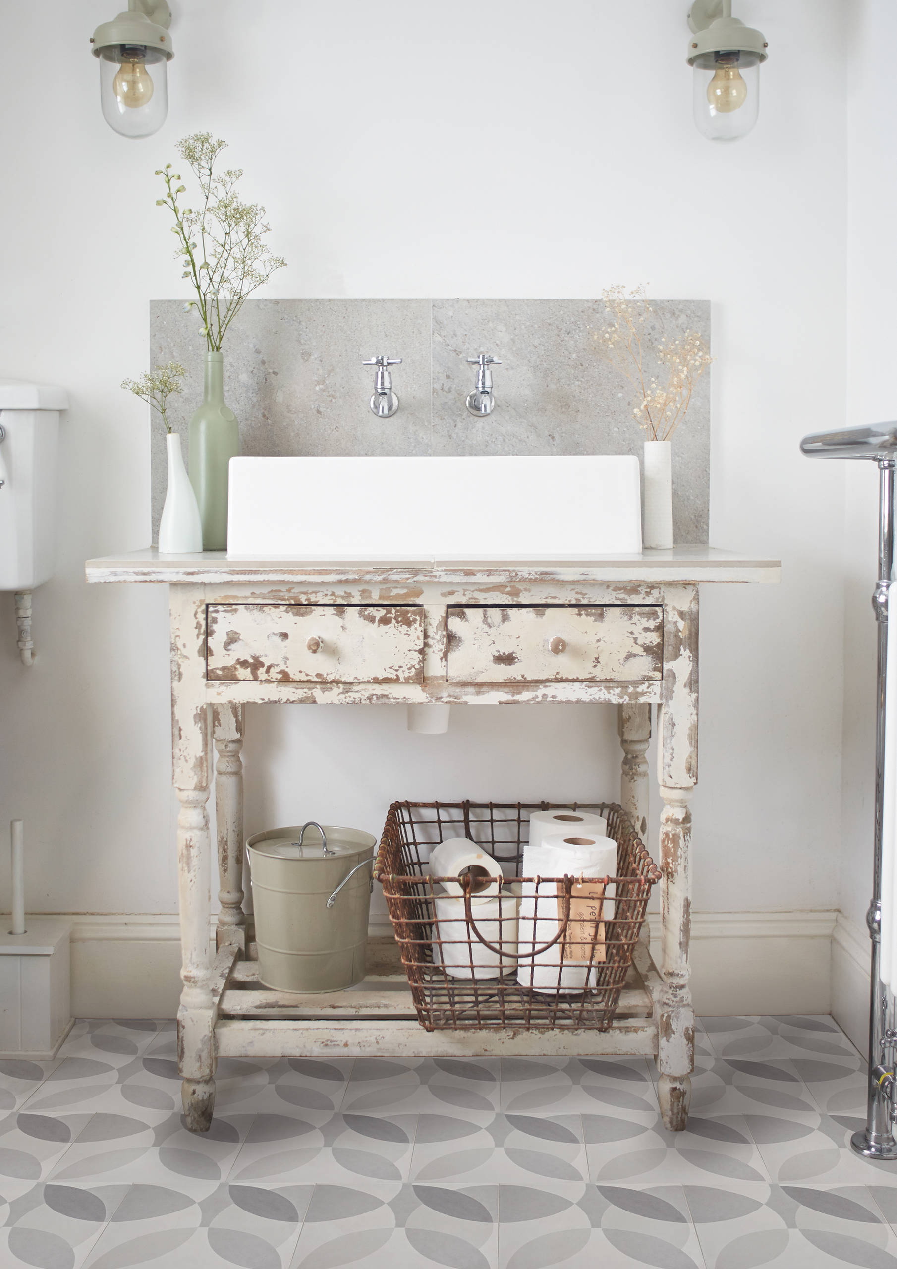 Se desejar, você pode instalar um lavatório na cômoda antiga e usar um armário restaurado em vez de um armário vintage para guardar toalhas e outros itens autônomos.