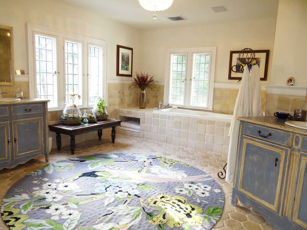 O banheiro Provence acomoda confortavelmente cadeiras de vime e raras armários para guardar acessórios de banho.