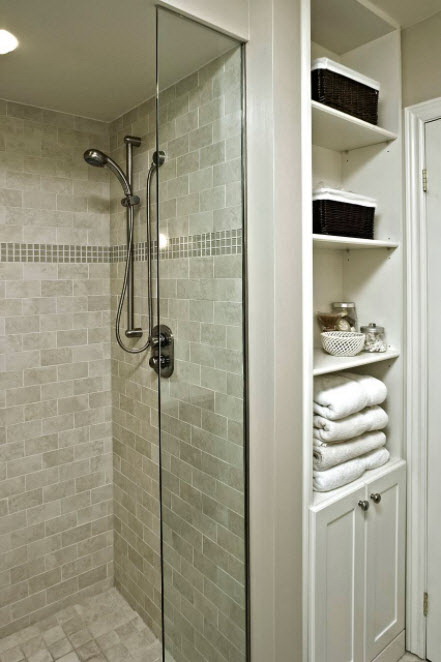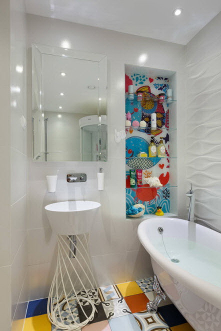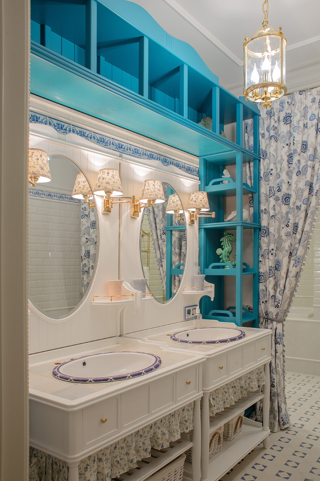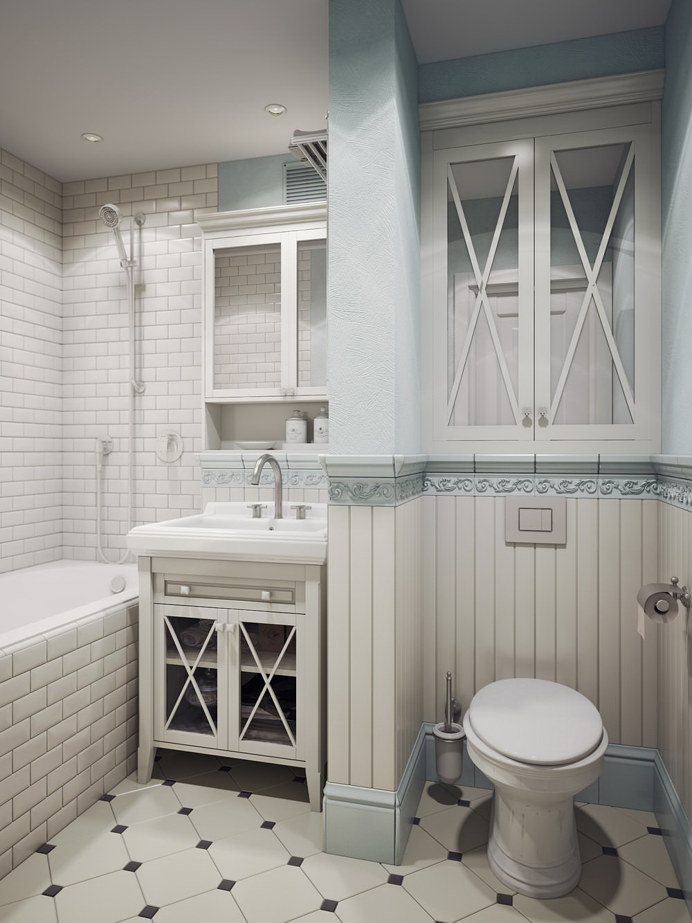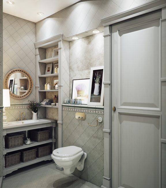 Ela é ecoada por um caso funcional para armazenar itens de cuidados de higiene. O estilo deve ser idêntico ao gabinete. O caso do banheiro é feito alto e estreito, e às vezes é substituído por uma típica cómoda estilo a * la Provence.