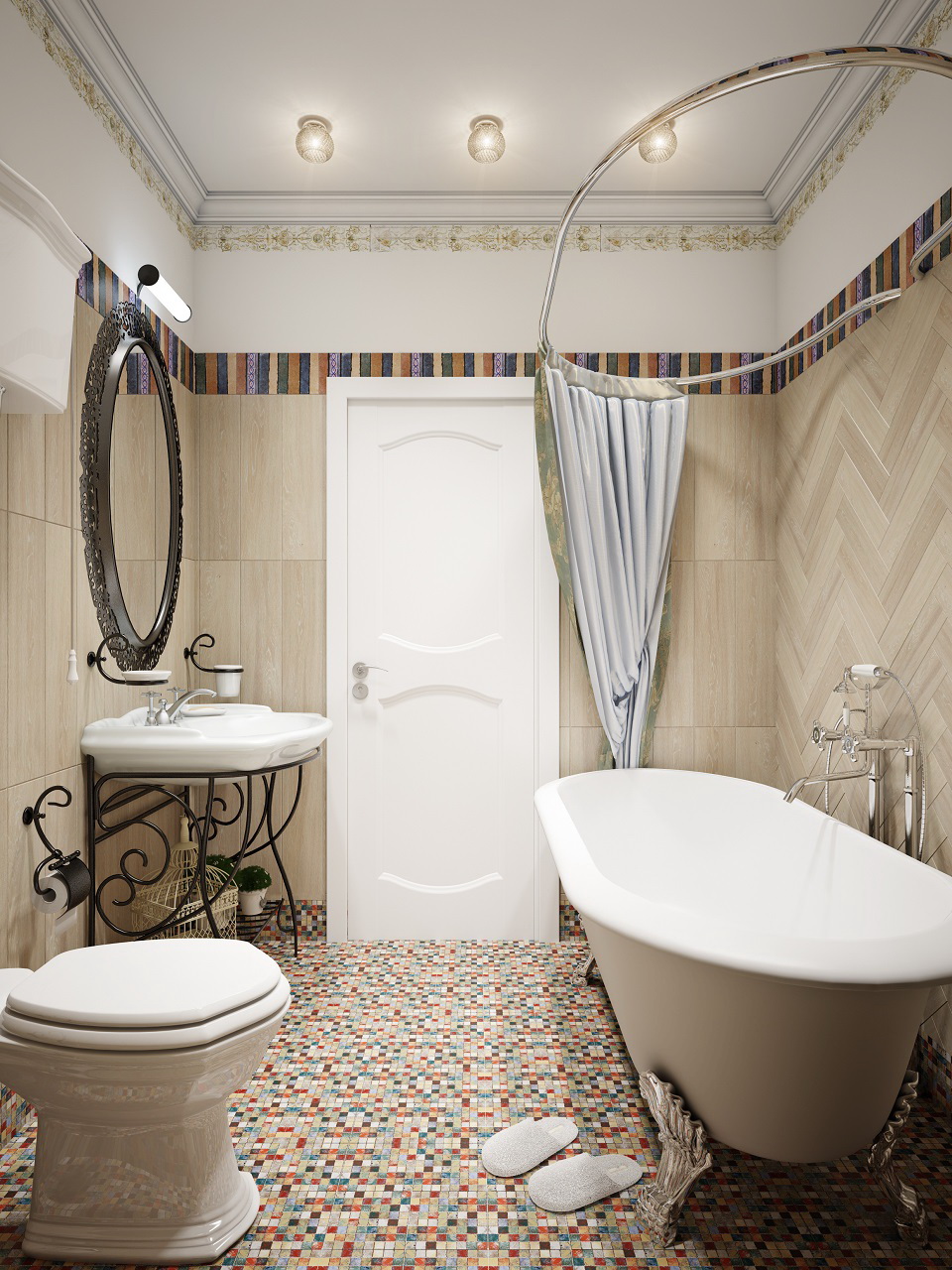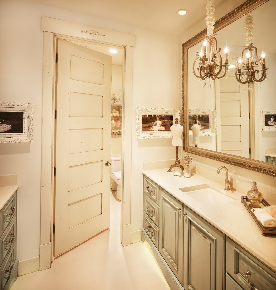 O tempo dita novas regras e no estilo de hoje Provence no banheiro, você pode ver ambos os tetos do estiramento e tetos feitos a partir de drywall.