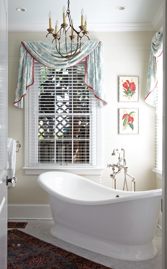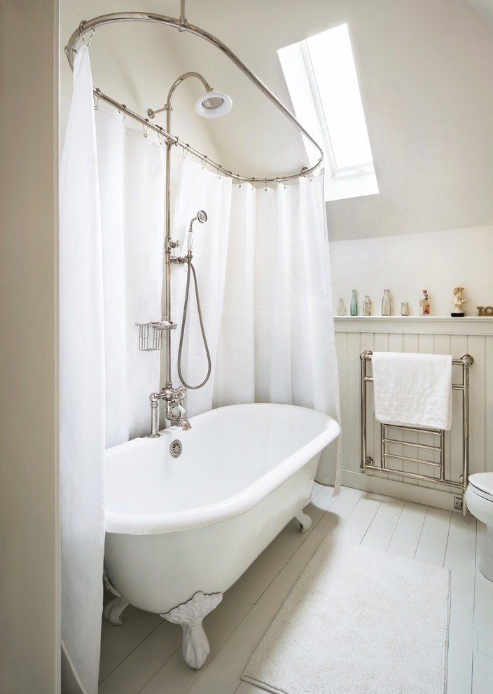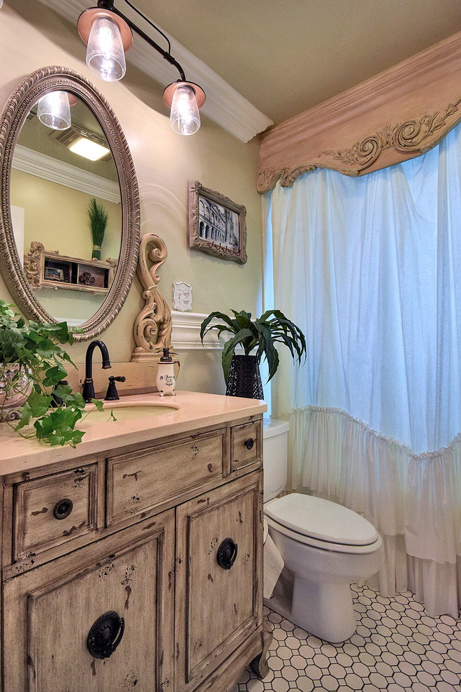Cortina de cortina para o banheiro em estilo provençal é pendurada no beiral de uma forma incomum. É redondo ou oval. Em qualquer estado, essa cortina parece nobre e elegante.