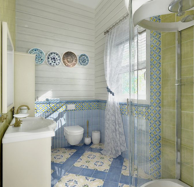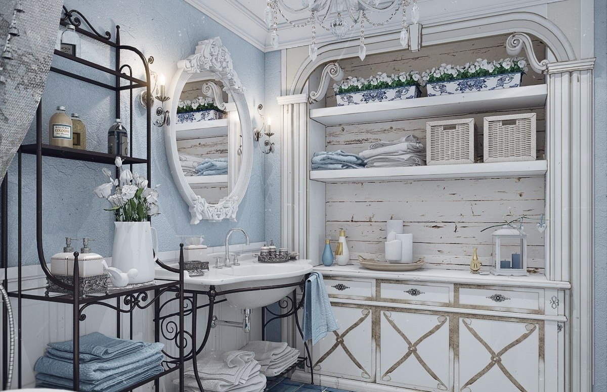 O banheiro provençal deve ser o mais saturado possível, o que significa branco cor deve ser escolhido em predominante.