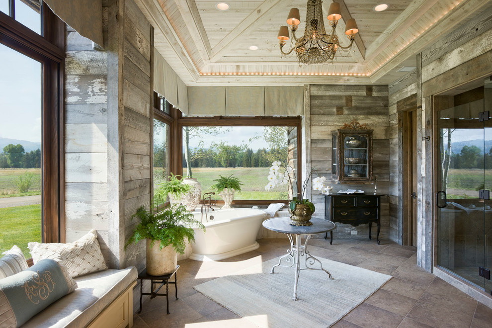 Em uma pitada, você pode usar um teto de holofote. No entanto, acredito que viola a harmonia do estilo e complementa sua modernidade, que está longe do modo de vida rural.