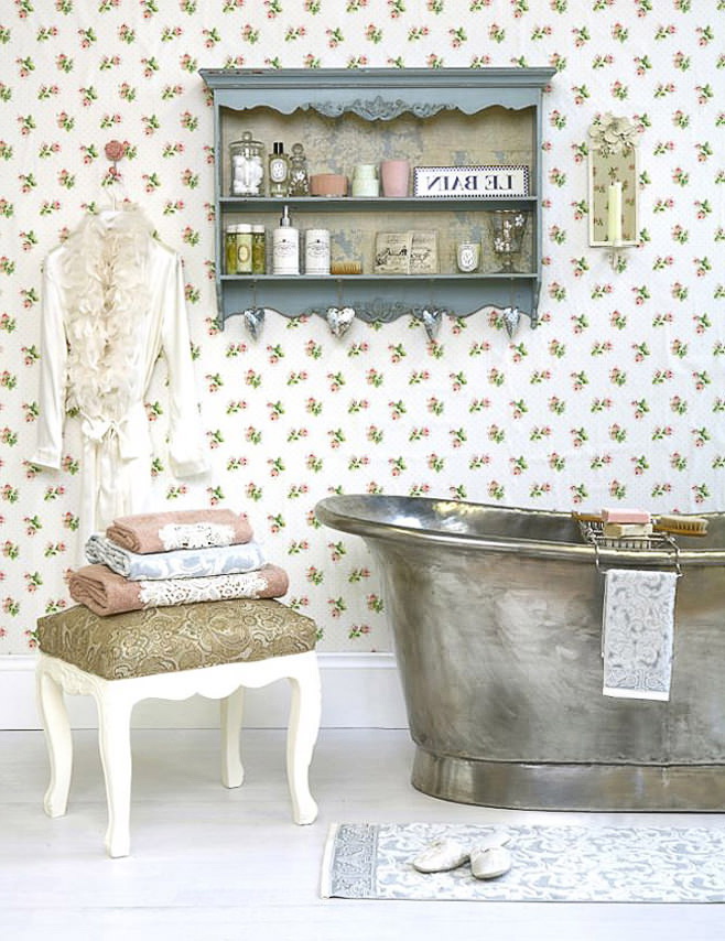 Para a decoração das paredes do banheiro no estilo da Provence é usado madeira ou cerâmica. Eles podem ser bem combinados, complementando-se com a sua textura. Absolutamente inesperado nas paredes do banheiro parece vinil à prova de umidade papel de parede com um tema floral.