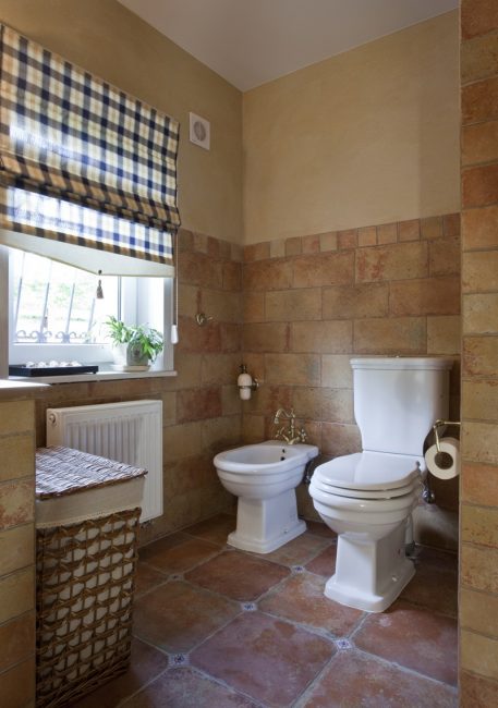 De acordo com todos os cânones do estilo provance, o banheiro deveria estar cheio de luz. Se o layout permite que você tenha uma janela, então isso é uma verdadeira sorte. A iluminação natural permite-lhe encher a sala com o sol natural, que não pode ser substituído por nenhum a lâmpada. Além disso, a janela é um excelente método de ventilação.
