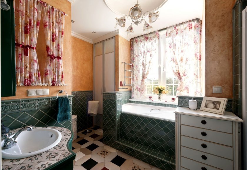 Cortinas de janela para um banheiro a Provence é um verdadeiro vôo de fantasia. Eles são monofônicos ou floridos, com e sem frescuras.. É importante que eles sejam feitos de materiais naturais (a seda é uma exceção).