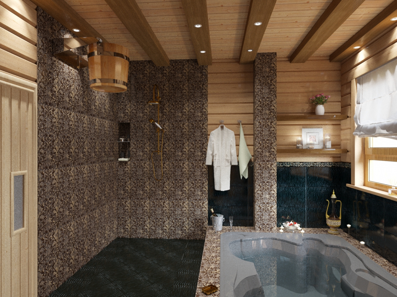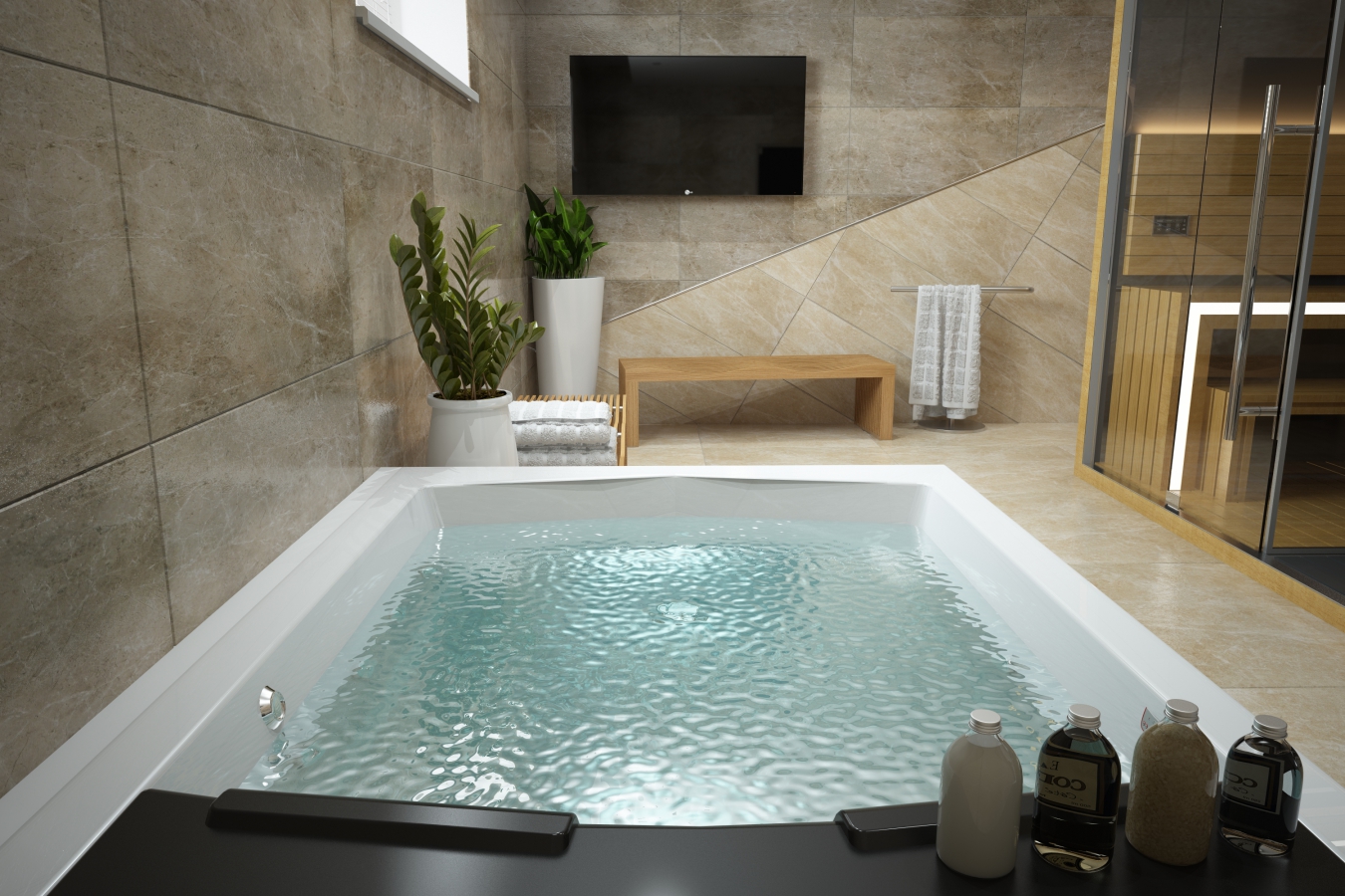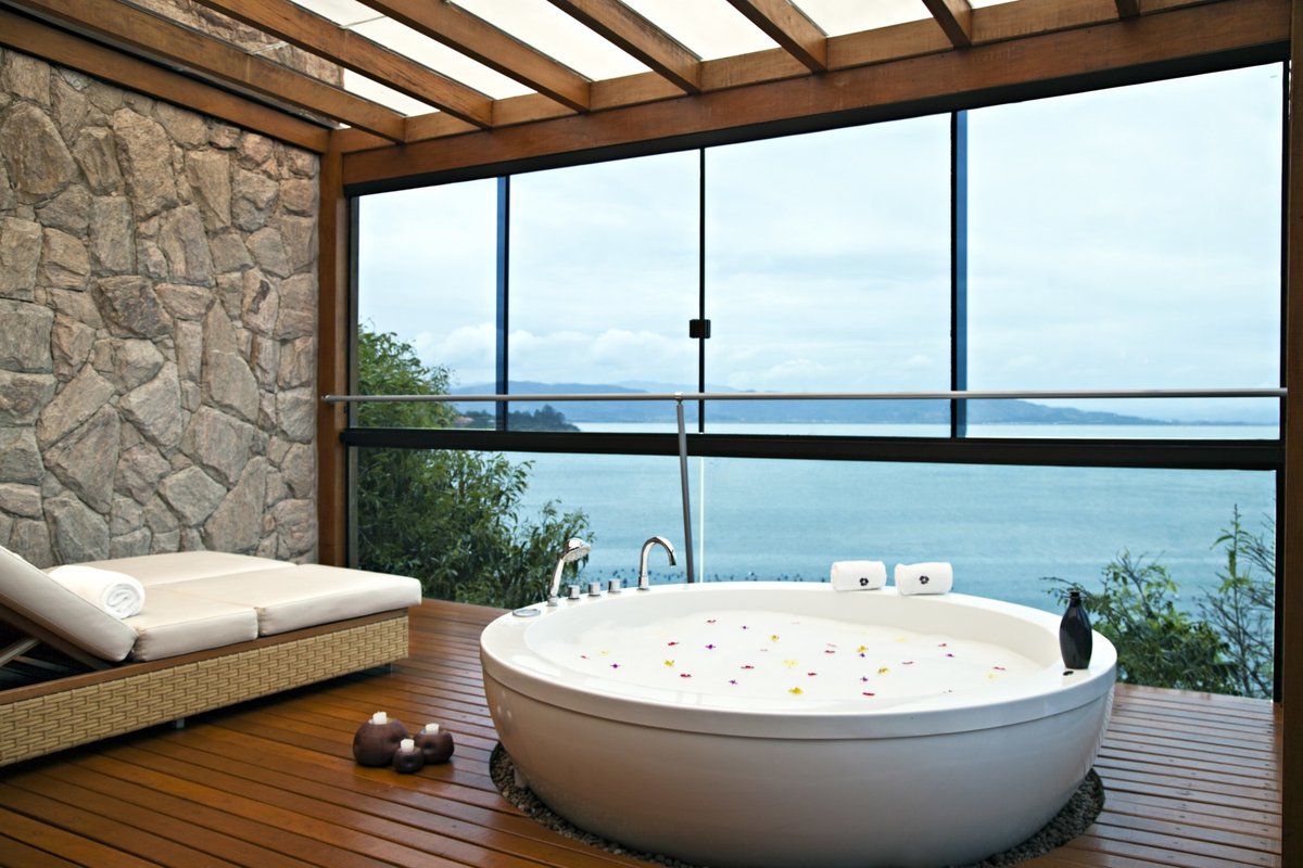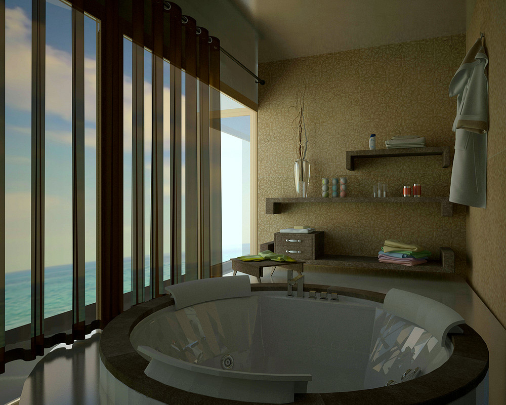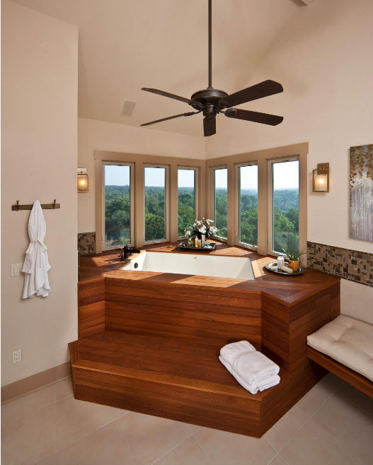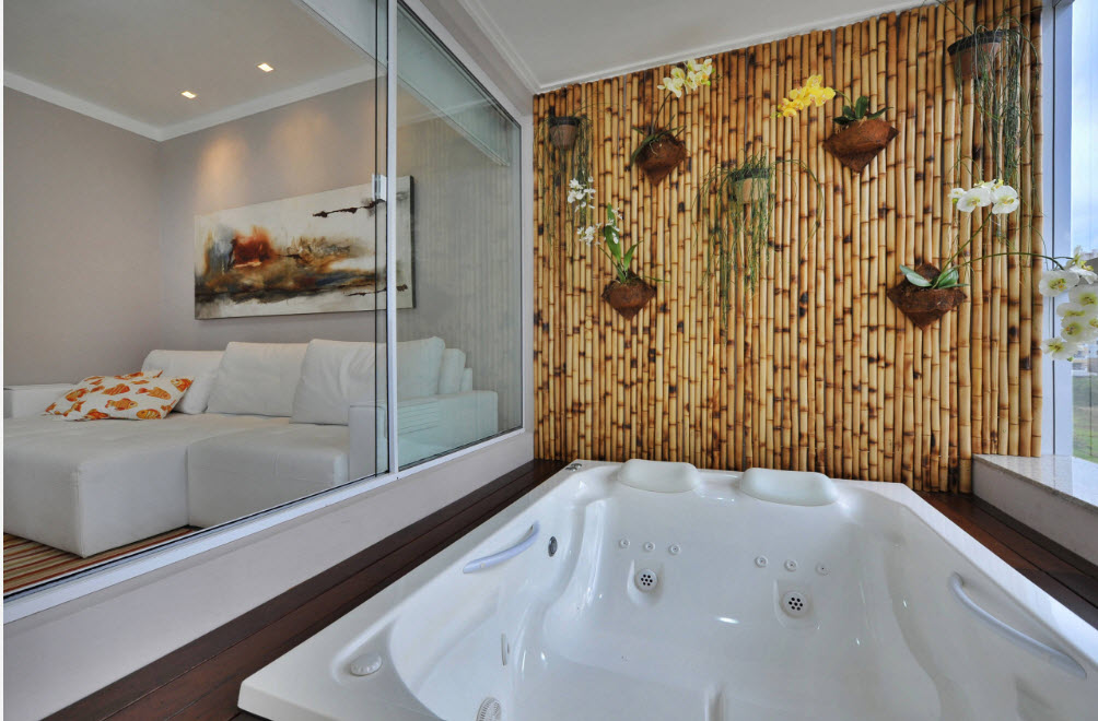 - Suportes de toalha podem ser instalados ao lado do jacuzzi, mobília para acessórios de banho e outros acessórios. Vasos com plantas serão uma ótima decoração.