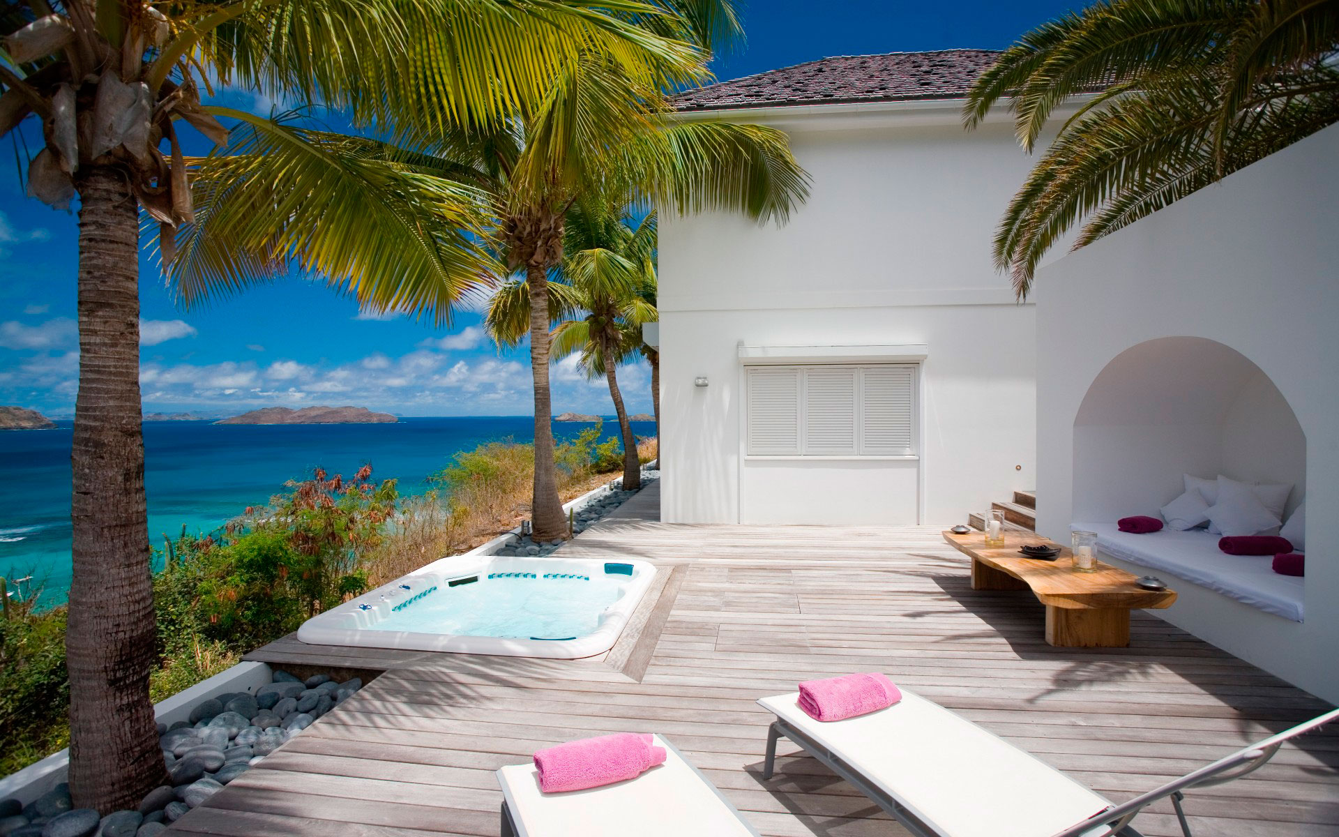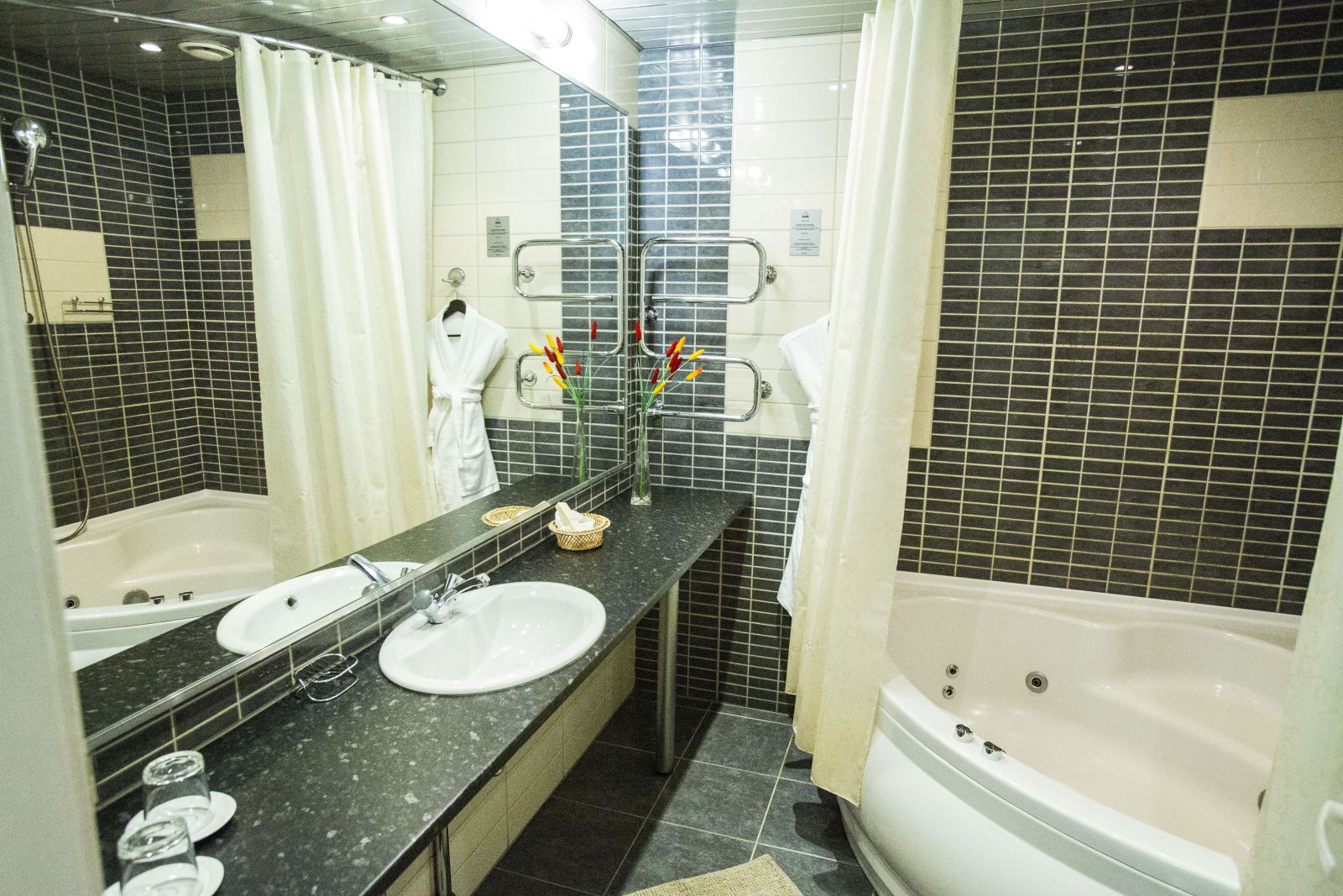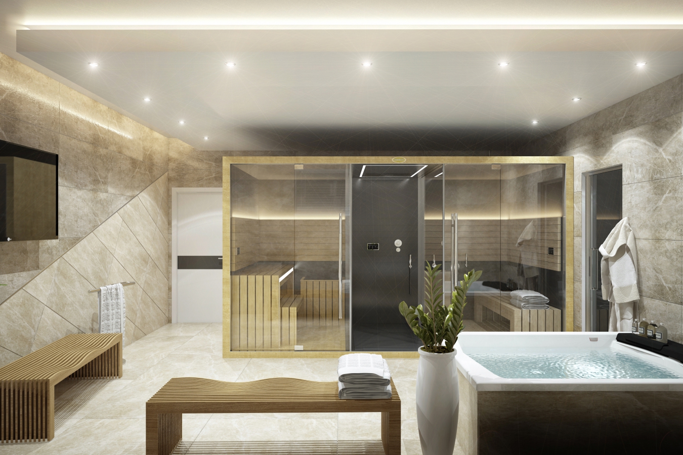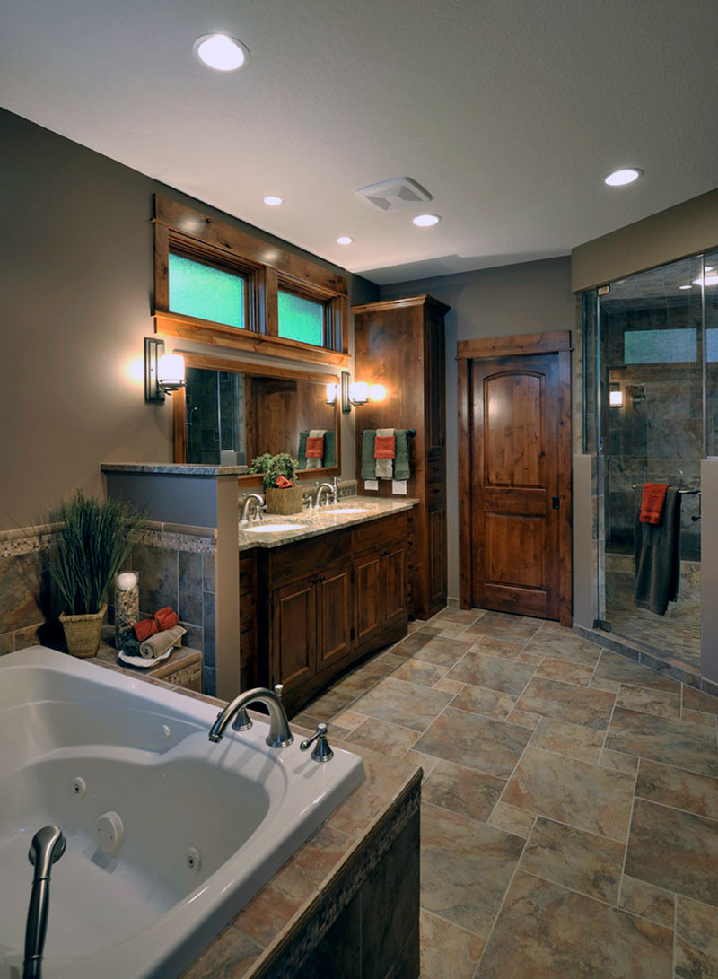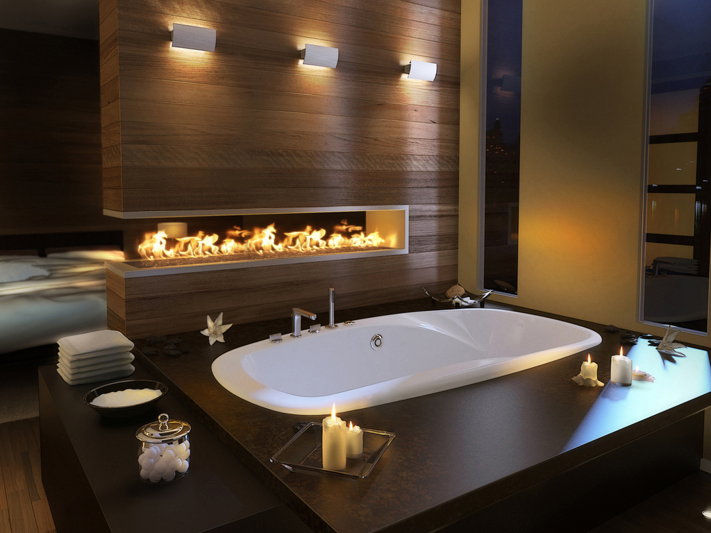 - Suportes de toalha podem ser instalados ao lado do jacuzzi, mobília para acessórios de banho e outros acessórios. Vasos com plantas serão uma ótima decoração.