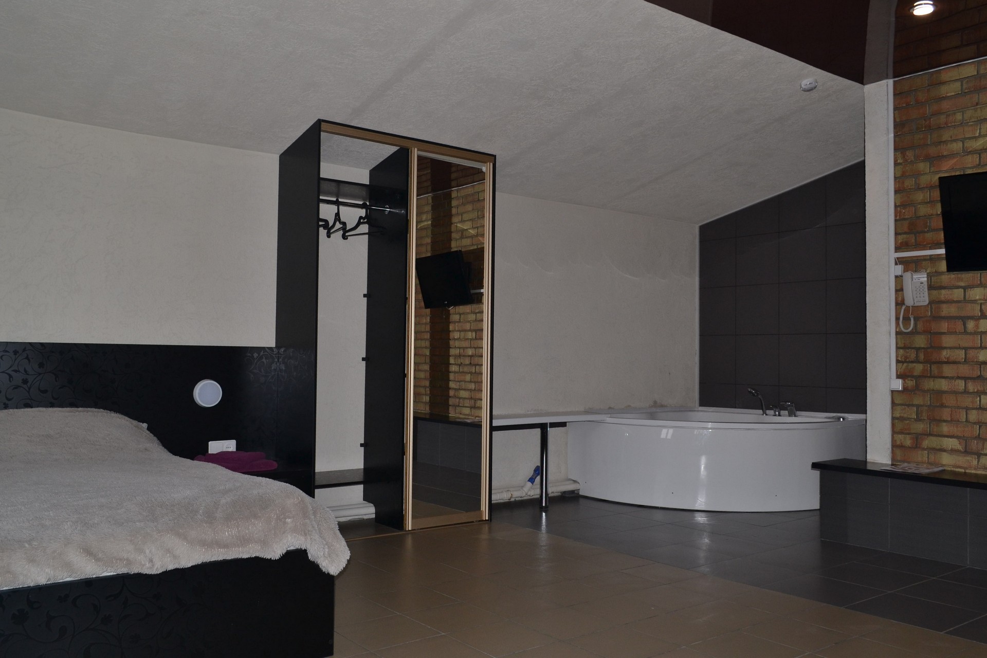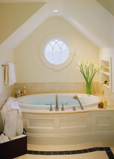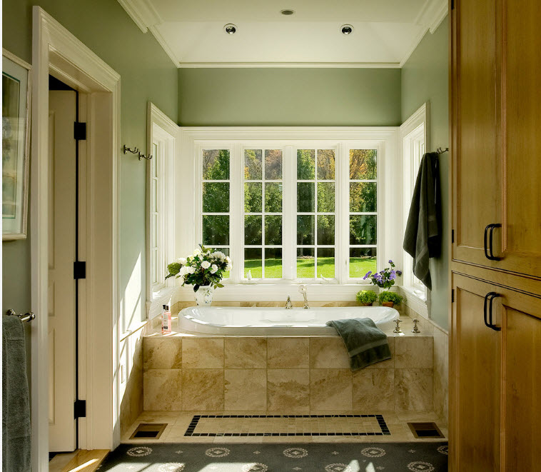 - Se o quarto tem uma janela de sacada e grandes janelas, então um jacuzzi é instalado neste local. Uma bela vista da janela ajudará a relaxar. No caso quando eles vão para o próximo prédio ou estrada, você pode pendurar cortinas romanas.