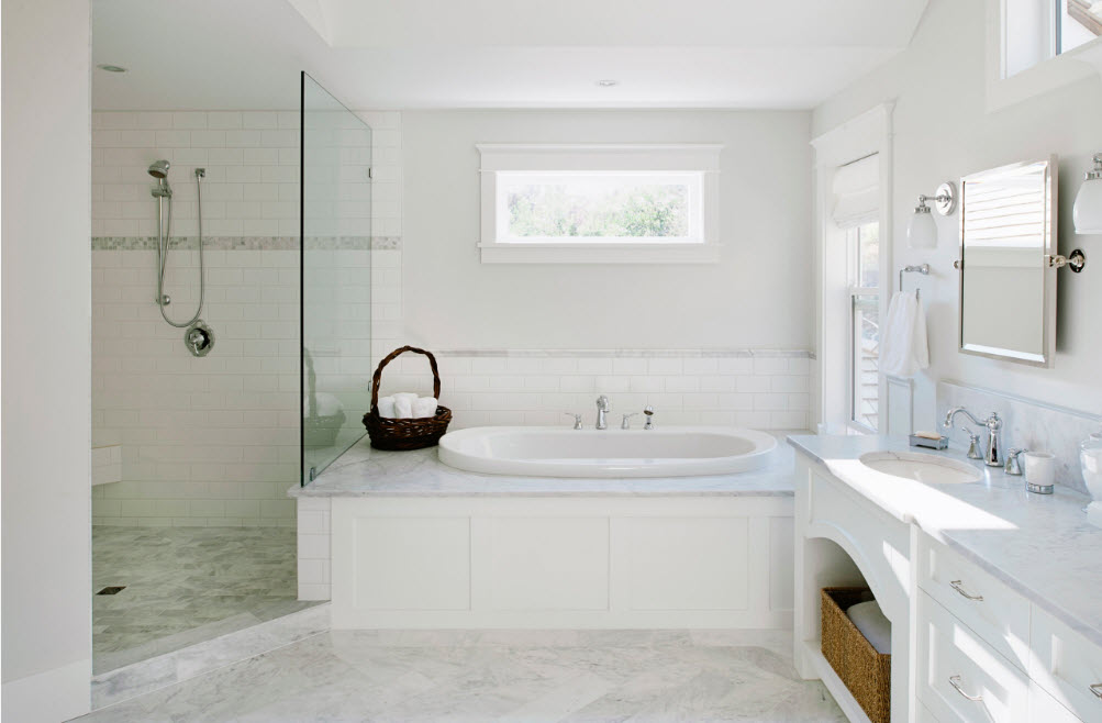 - No banheiro clássico, emoldurado telhas, a grande banheira da massagem de ferro fundido ou mármore olhará com sucesso. O uso de ornamentos decorativos é permitido.