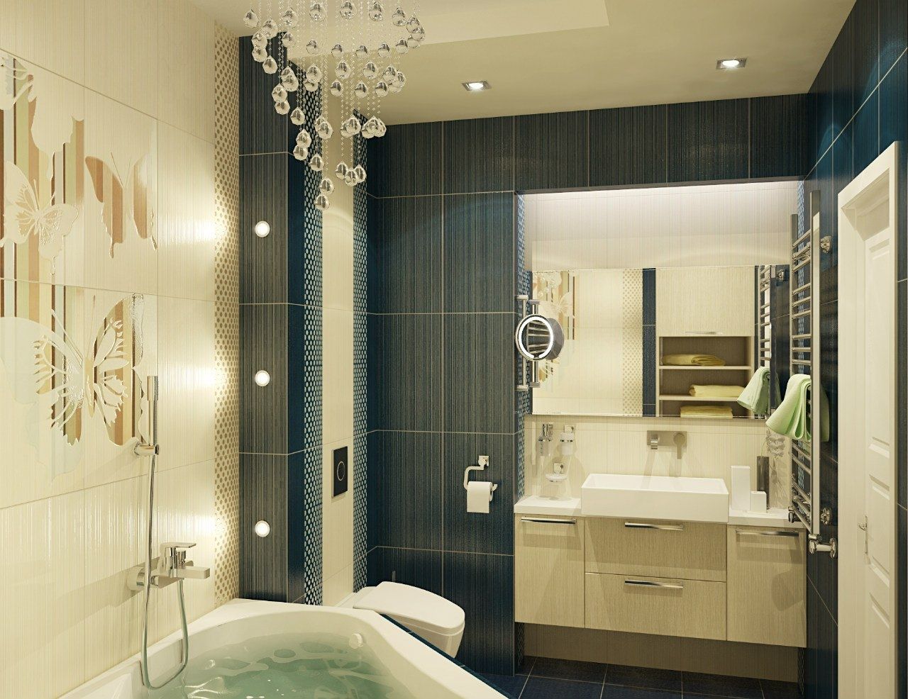 - Banheiro requer boa iluminação. Com a ajuda de lumináriasVocê pode dividir o espaço em zonas. O uso de uma luz de fundo combinada é aceitável.