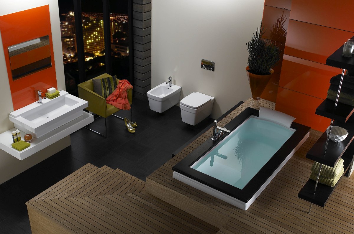 - Uma opção adicional em salas compactas é a colocação do banho ao longo da parede lateral. Para tal solução é adequado design retangular. O banheiro e a pia são colocados na parede oposta.