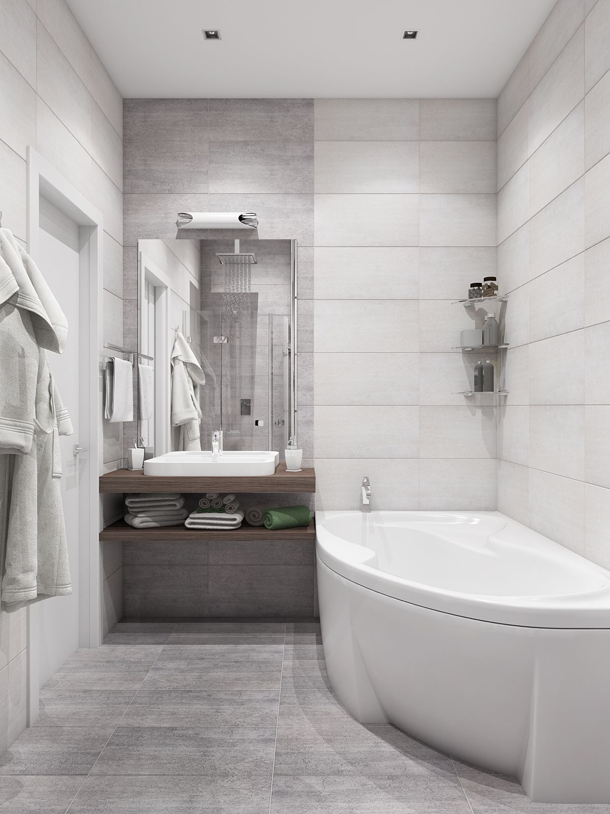 - Em salas pequenas e combinadas com um banheiro, a decisão correta seria a colocação angular. Eu recomendo instalar um jacuzzi na frente da saída, mas aqui o lugar onde as comunicações serão conectadas influenciarão.