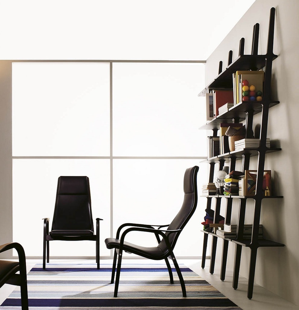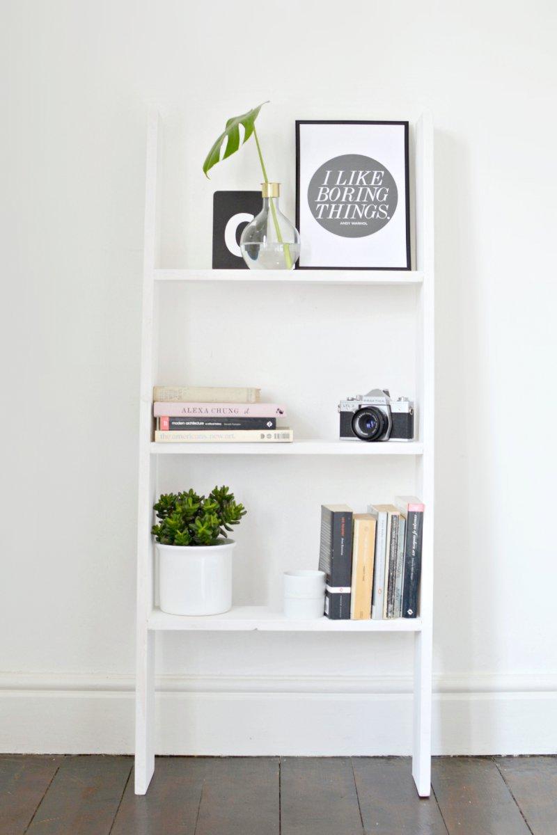 Mesmo nos cantos da sala há uma oportunidade de colocar algumas prateleiras adicionais. Se você é um inquilino e não quer instalar prateleiras de canto, considere um rack articulado na forma de escadas.