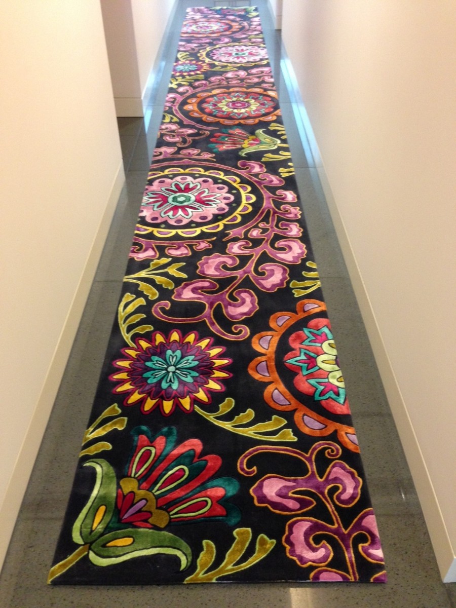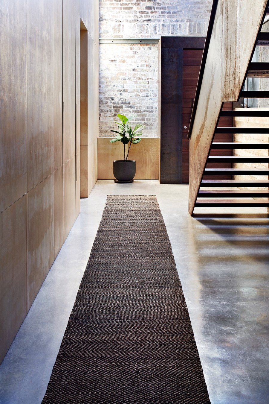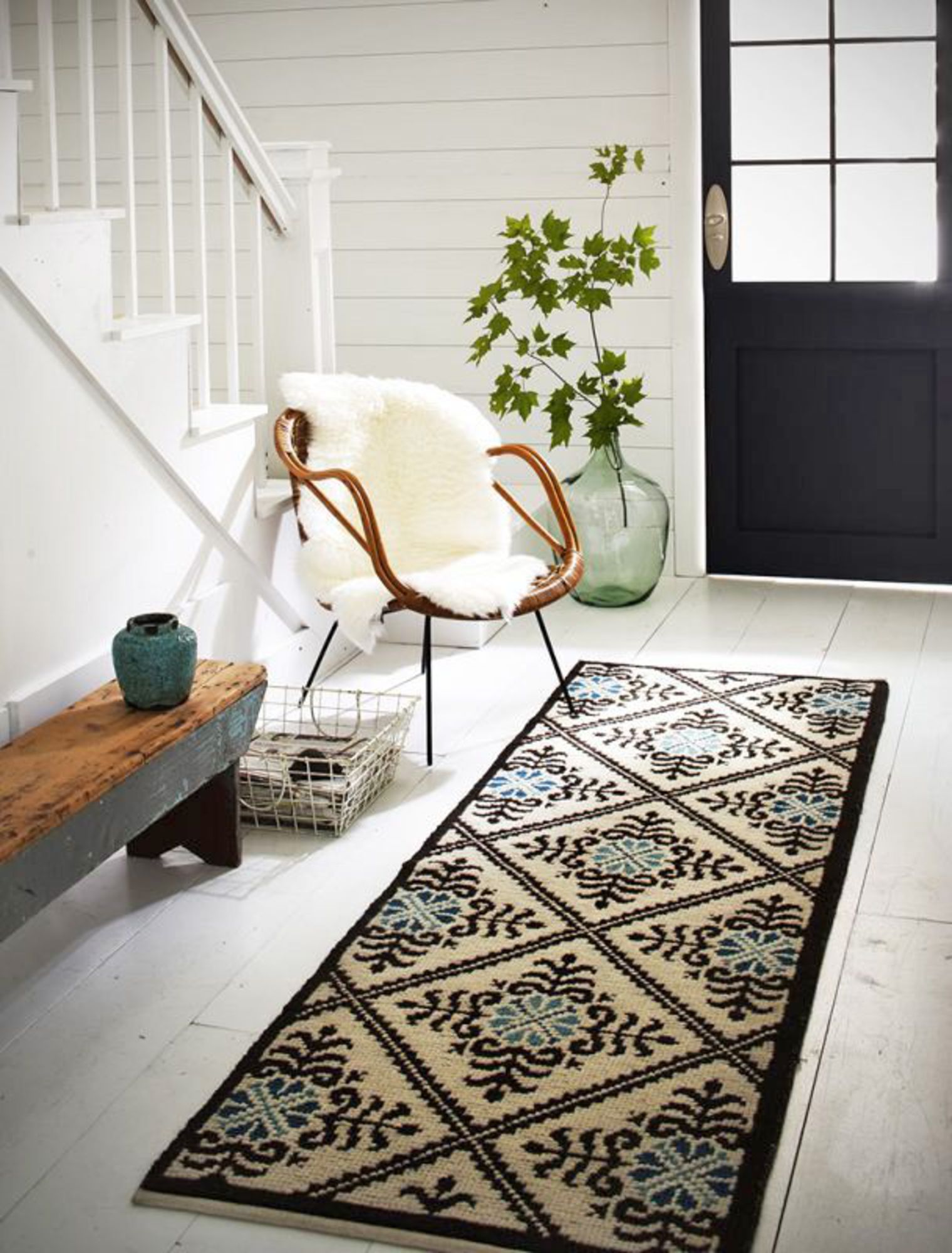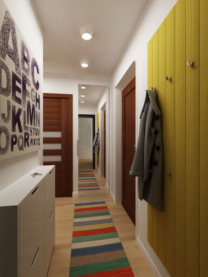 Muitos apartamentos têm um corredor de entrada longo e estreito. Embora esse espaço possa ser um problema para a decoração, a chave é a escolha de objetos que imitam a forma estreita e comprida do corredor para criar dinâmicas. Instale prateleiras de parede plana alongadas e tapetes longos (especialmente apreciados com brilhos).