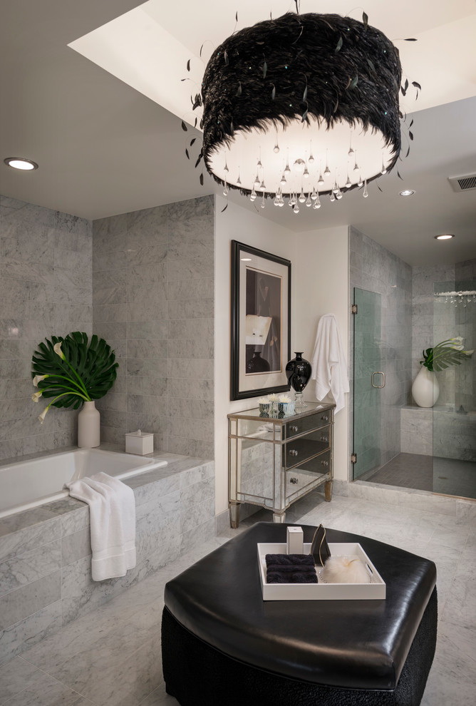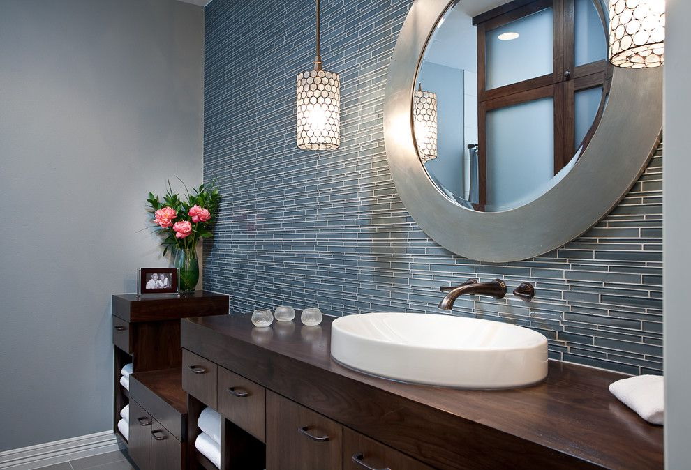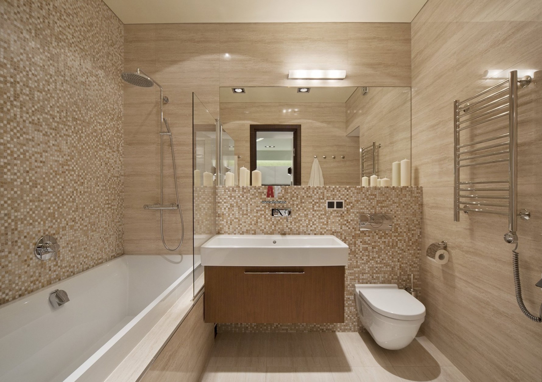 Modern é outro estilo que dá uma sensação de luxo e riqueza. O principal elemento deste estilo é mosaico. Ela vestida e paredes, e encanamento, e até mesmo espelhos. O fundo é uma telha de tons pastel. Cores brilhantes ajudam a colocar os principais acentos na sala.