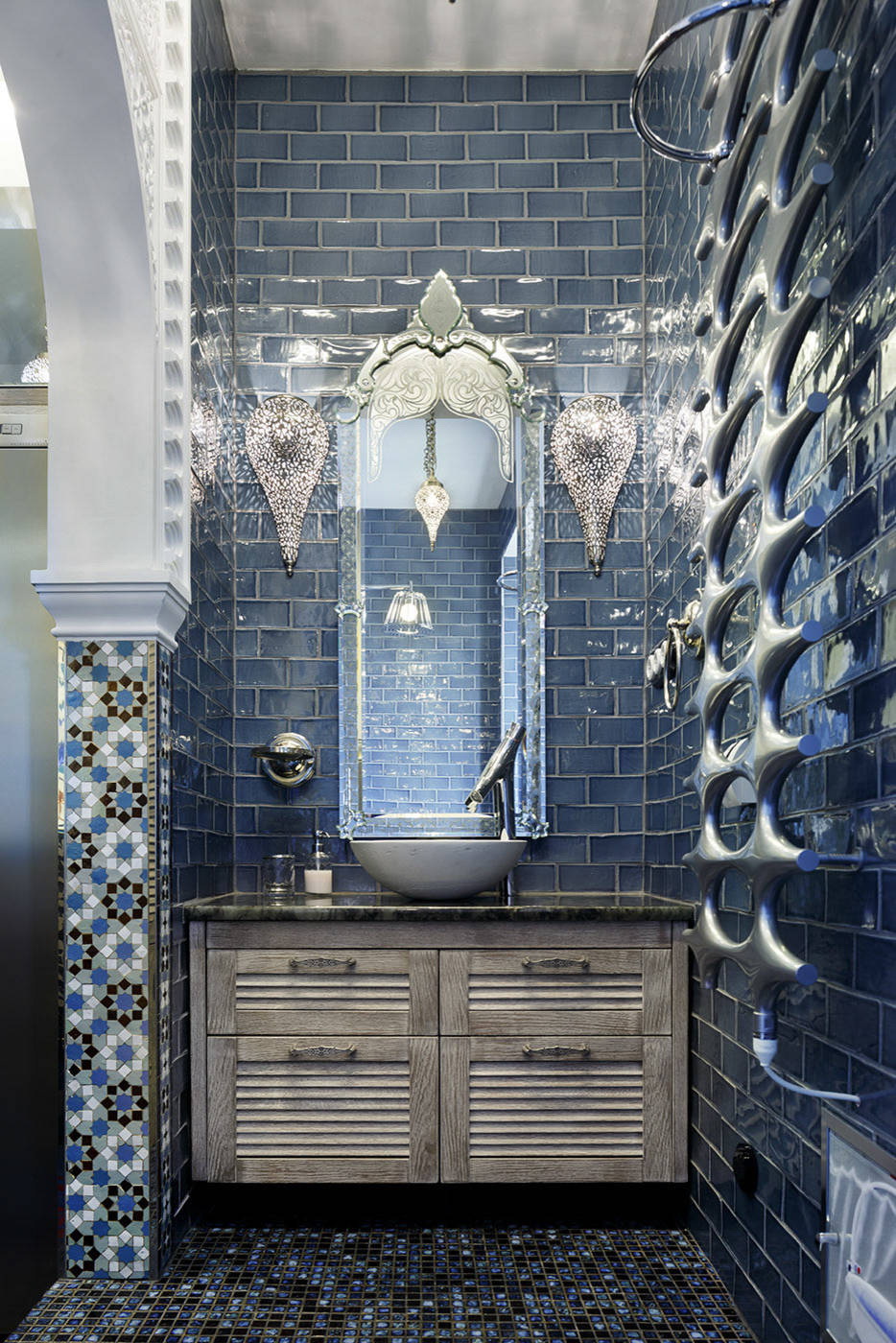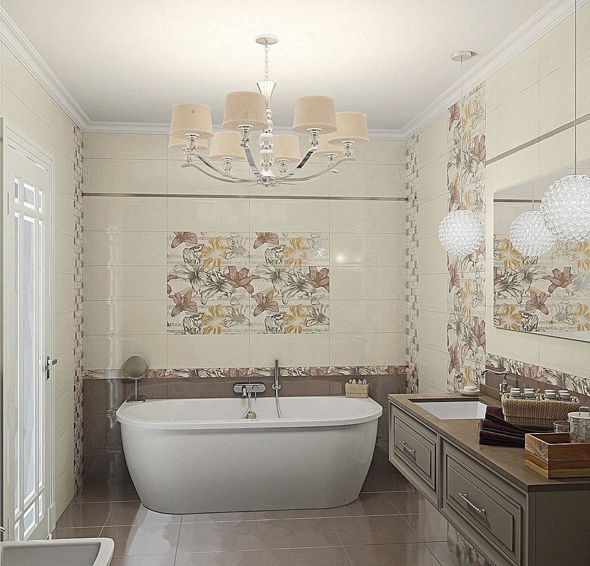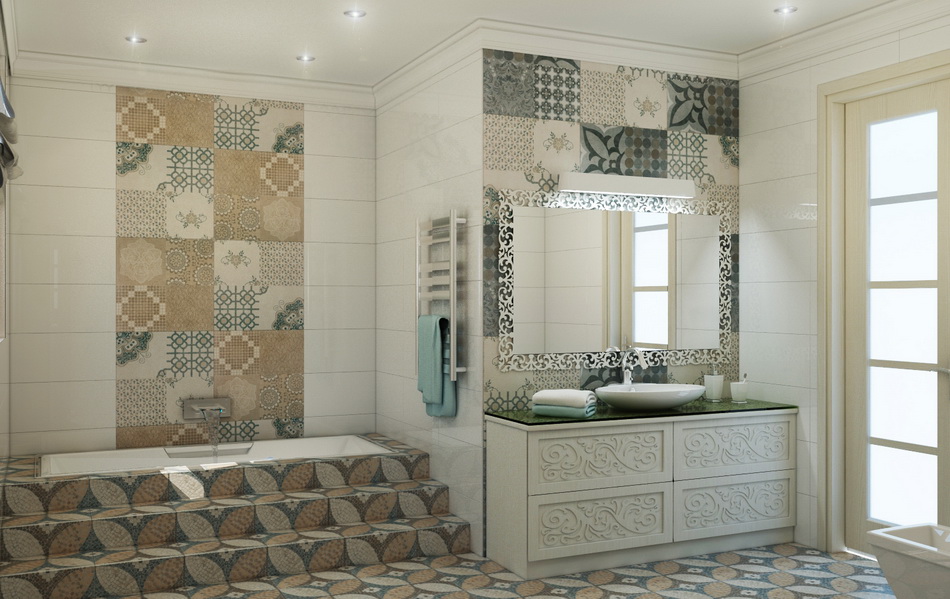 Todas essas opções, como regra, incluem o uso de telhas monocromáticas brilhantes de todos os tons de azul, branco e bege. Há também uma ramificação como o neoclassicismo. É combina as notas da modernidade e todas as tradições do design clássico. Como complemento aos estilos clássicos, elementos de ouro e bronze são perfeitos.