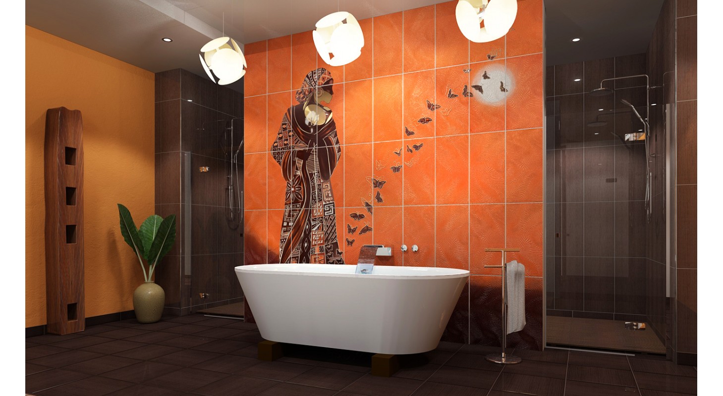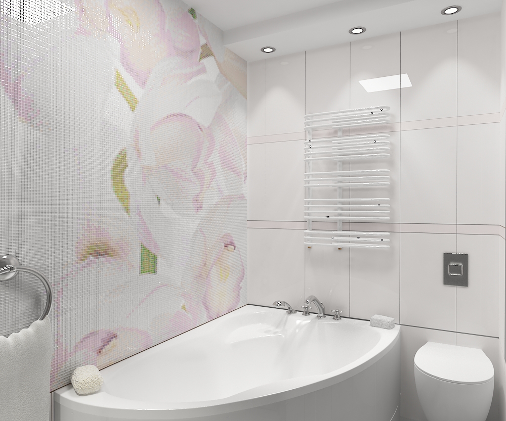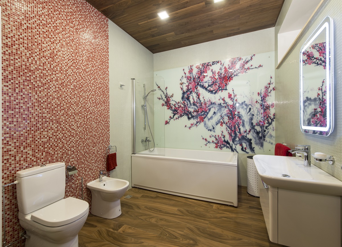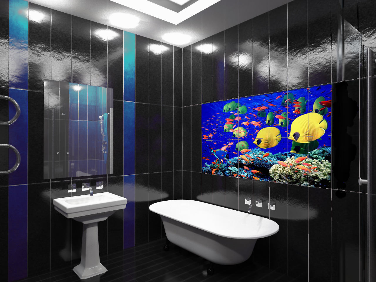 Um painel para uma pequena sala não funcionará, mas em um banheiro de tamanho médio, e ainda mais em um grande, tal desenho parecerá interessante e muito bonito. É necessário considerar cuidadosamente a escolha do estilo do painel. Este design não é muito caro, você pode escolher um painel em qualquer categoria de preço. Além disso, a técnica de revestimento também não é complicada, e se você tiver pelo menos alguma ideia desse tipo de trabalho, você pode lidar com isso sozinho.