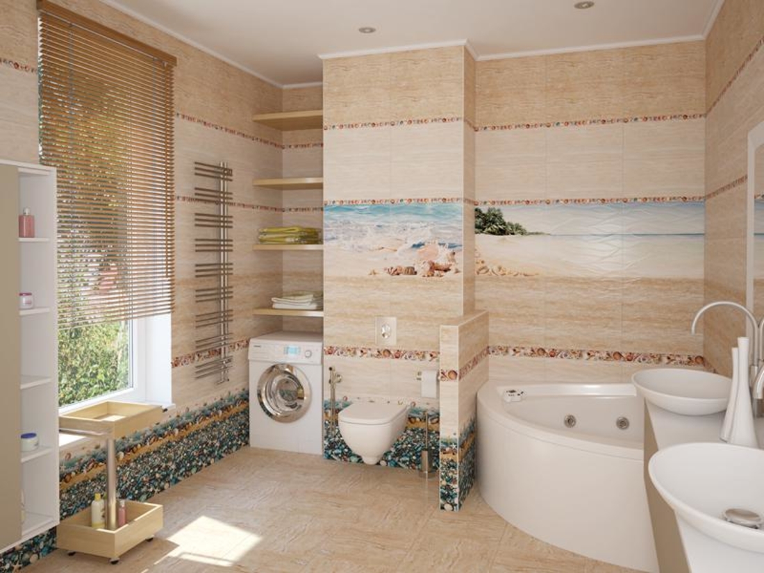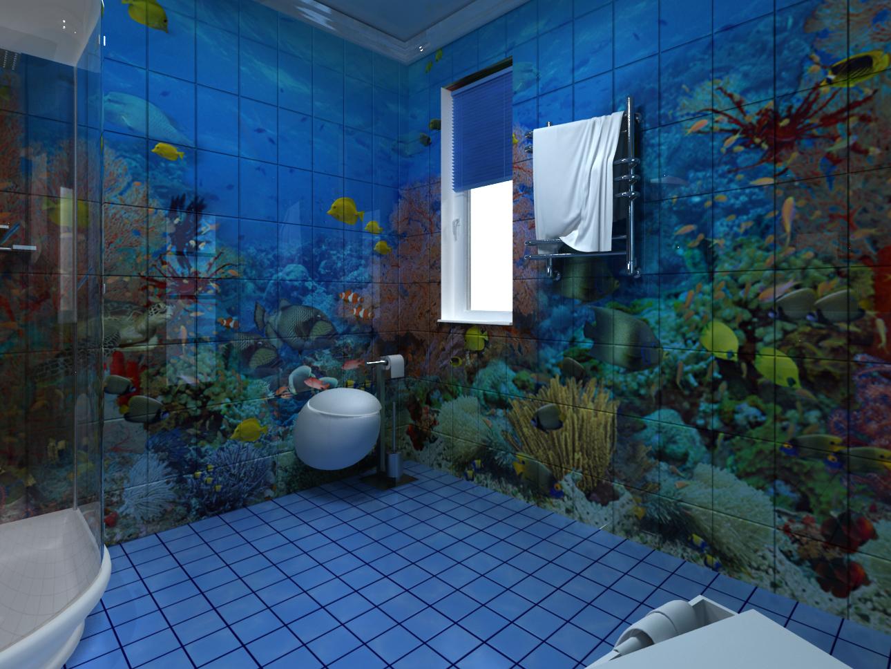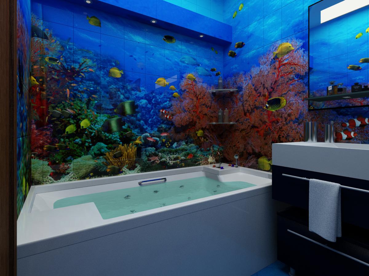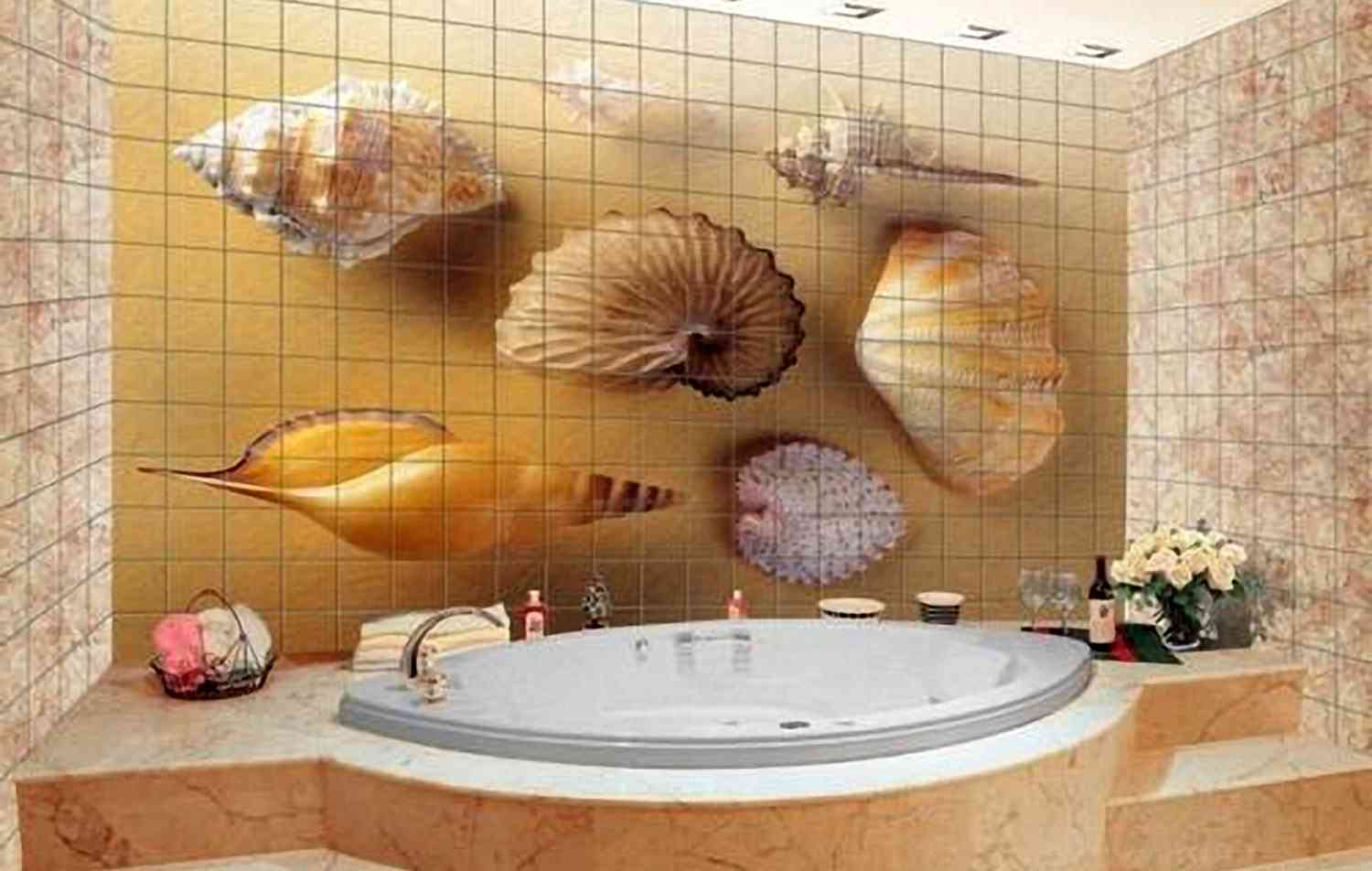 A telha 3D de um tema marinho parece harmoniosamente. Este estilo é geralmente bem adequado para o banheiro. Mas, para uma pequena sala, você precisa combinar competentemente o padrão em si e as paredes lisas, caso contrário, o design pode parecer difícil de ser colado e estreitar significativamente o espaço da sala.