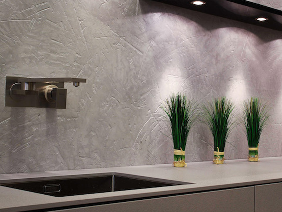 Este é um gesso polido com um verdadeiro fator "WOW". Feita a partir de pó de mármore muito fino, é aplicada com camadas finas e a última camada é polida para criar um alto brilho e reflexo impressionantes com grande profundidade.
