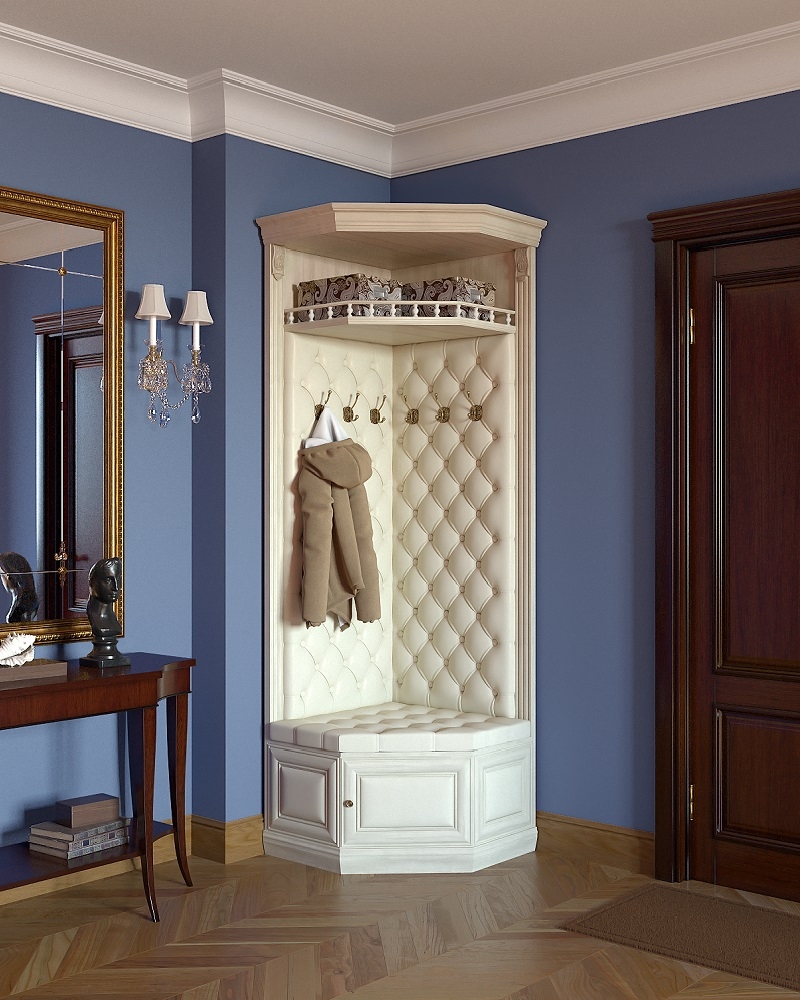 Alojamento de móveis junto muros - uma solução padrão, mas muito razoável, nos casos em que há muitos ângulos retos no apartamento e poucos metros quadrados. Esquinageralmente tem a forma gabinete (muitas vezes - guarda-roupa), portanto, protege as coisas não só da luz do dia, odores desagradáveis, mas também do pó, bem como constante atrito (não tendo restrições de porta), colocando roupas em risco de poluição permanente: moradores de apartamento gritando para frente e para trás Aja em suas roupas quentes.