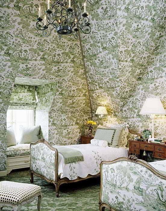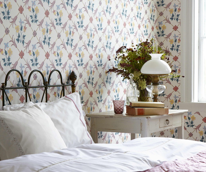 Tons pastel de cor rosa, bege, cinza-azul e padrões simples na forma de losango, quadrados, balões e navios, pássaros e árvores, listras, emblemas prevalecem.