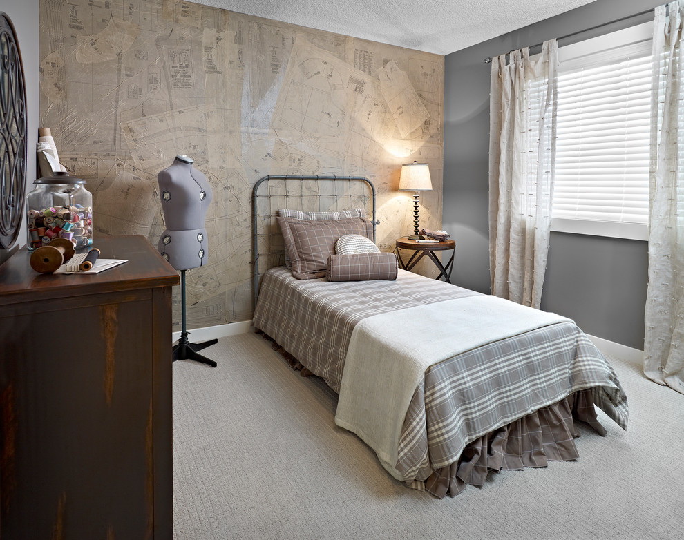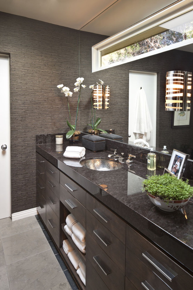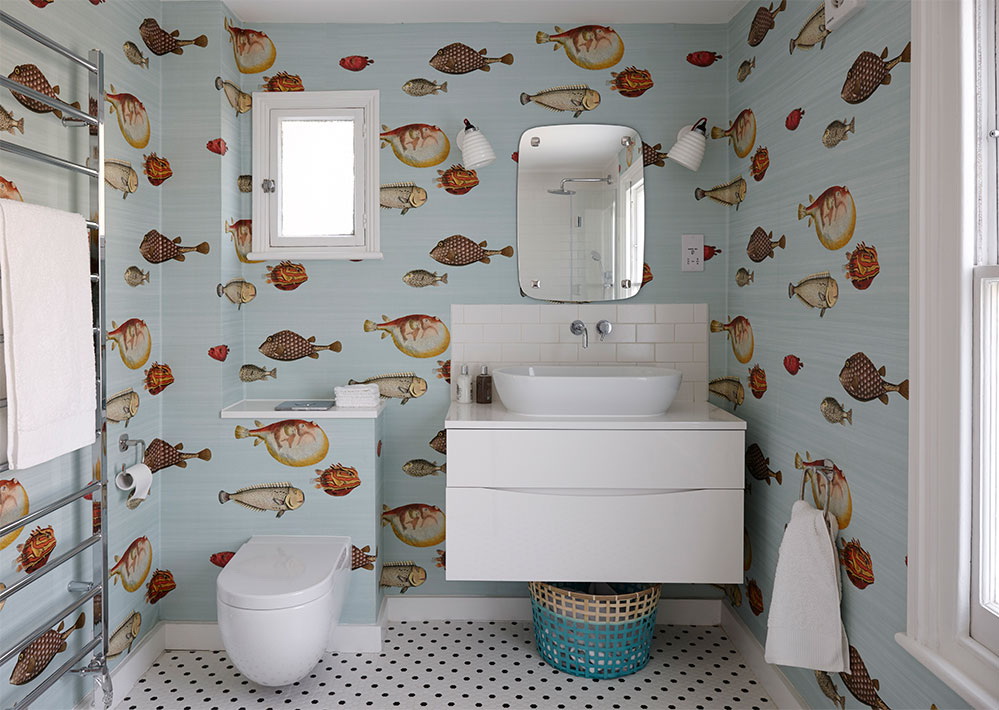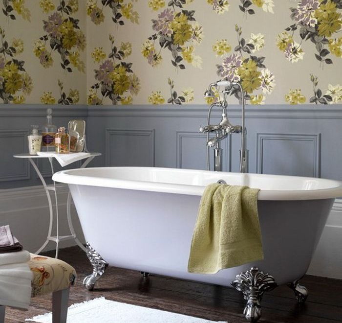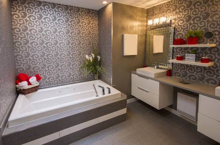 O vinil na base não tecida é perfeito para estes quartos, eles são mais baratos, e o acabamento em si é mais simples do que ao escolher um azulejo ou plástico.