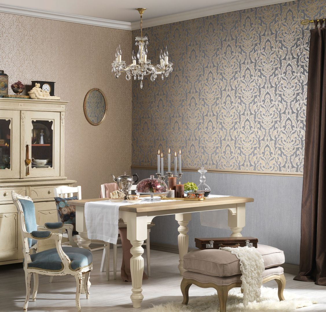 Motivos florais e ornamentos, textura para um caro gesso veneziano, tons de cinza escuro, vinho e marrom, tira estrita em tons contrastantes e suavemente móveis - todos estes sinais característicos dos interiores no estilo clássico.