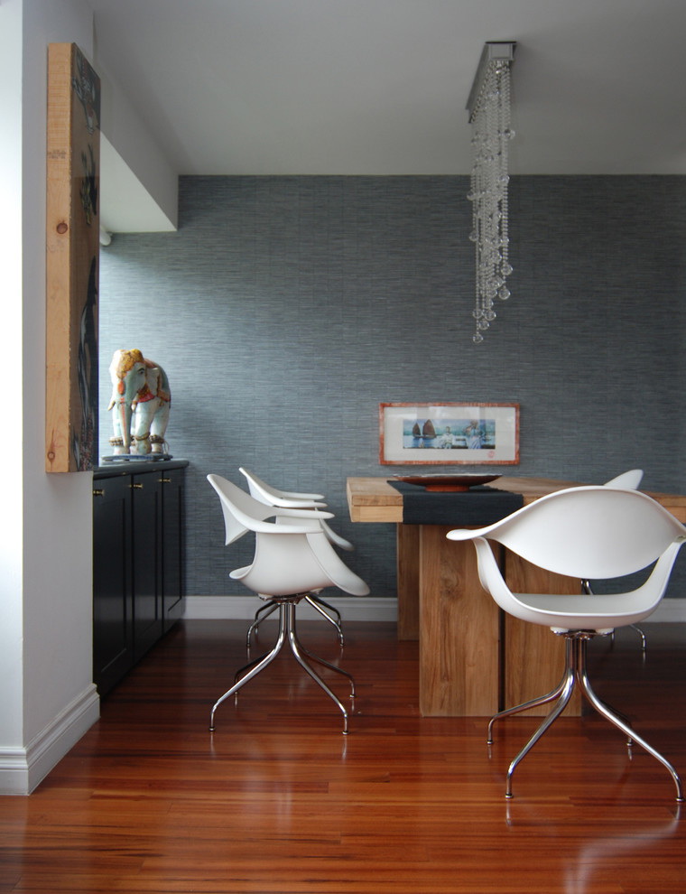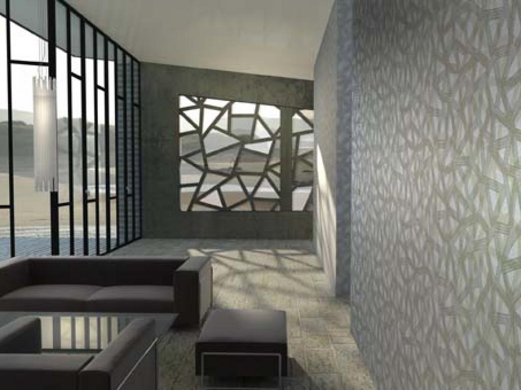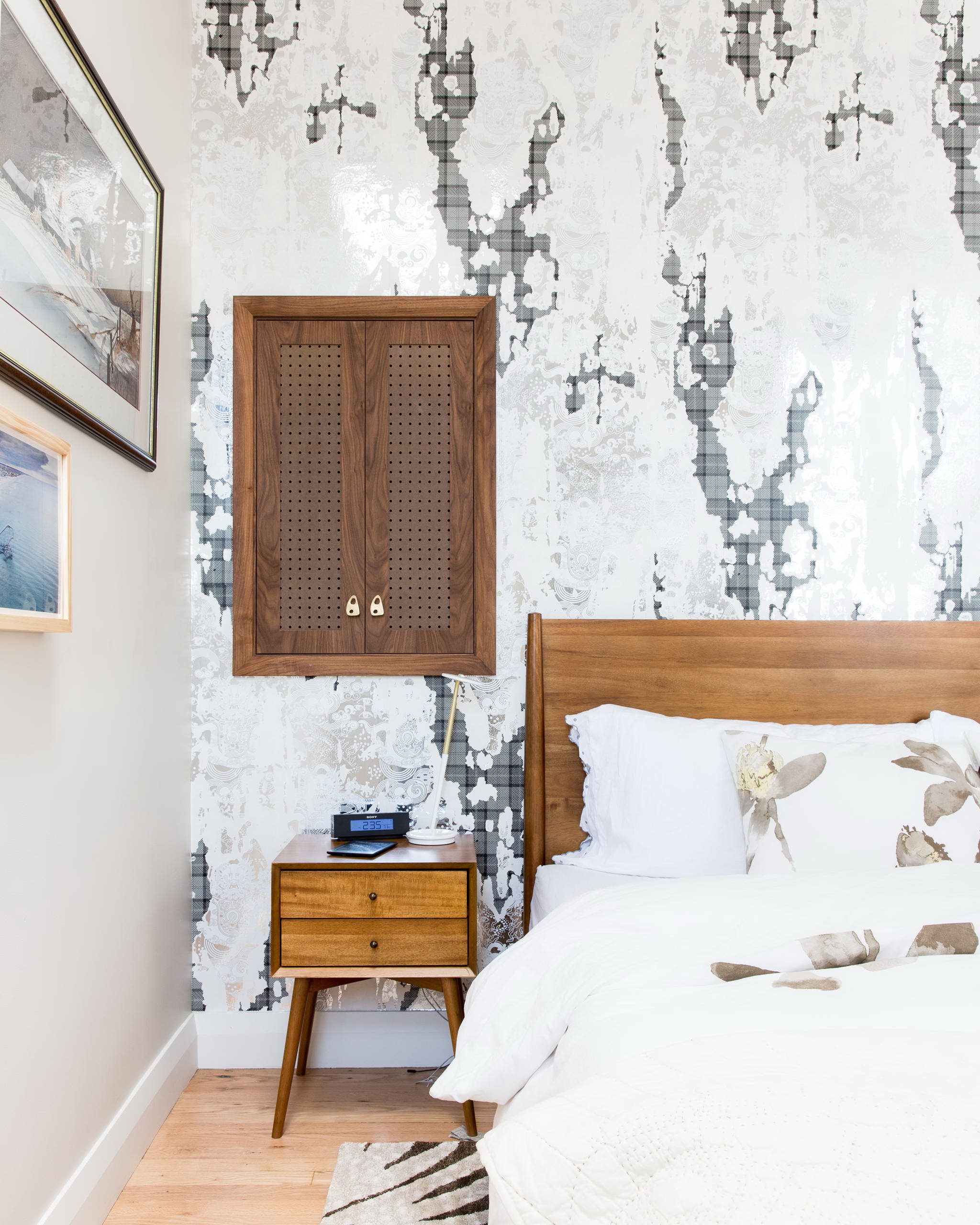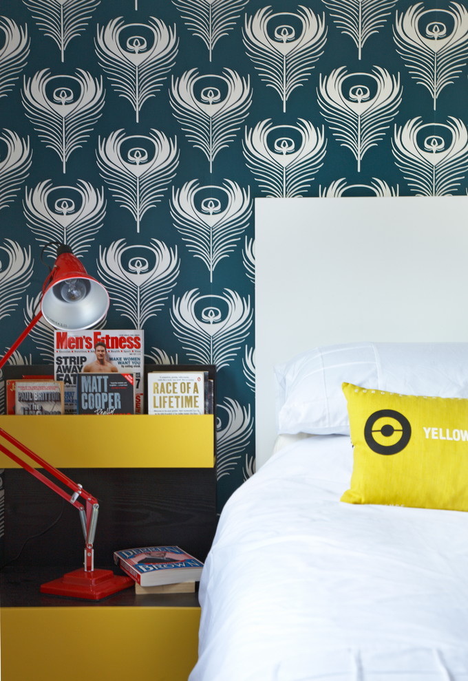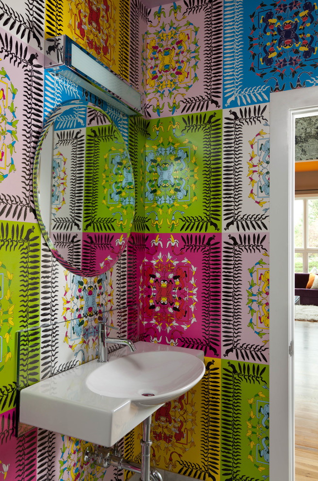 Serigrafia e papel de parede de vinil pesado em alto-relevo funcionam bem. Outra opção possível é papel de parede plano textural liso combinado com foto ou impressão estéreo.