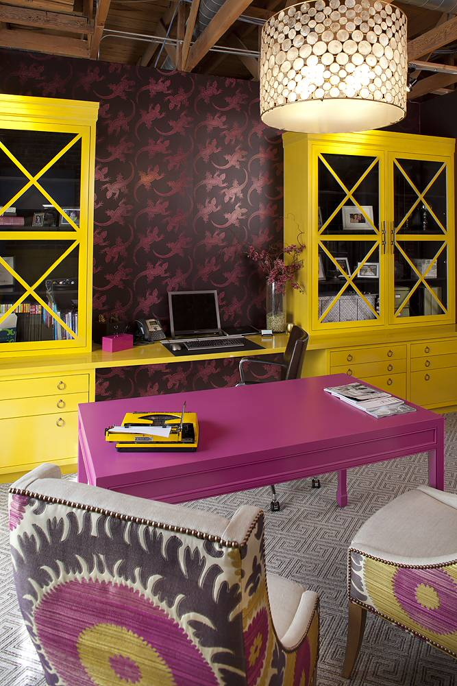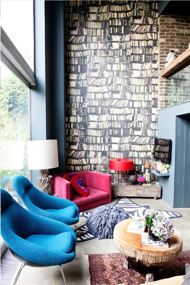 Para variar, você pode usar uma única imagem estéreo, por exemplo, com um relógio. Se houver pouco mobiliário no escritório ou simplesmente não há espaço extra para ele, cole com impressão de fotos, imitando armários, prateleiras para livros.