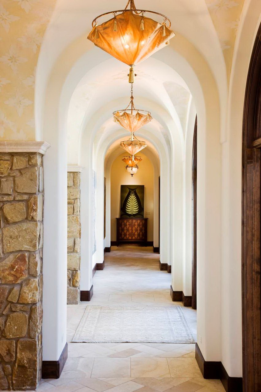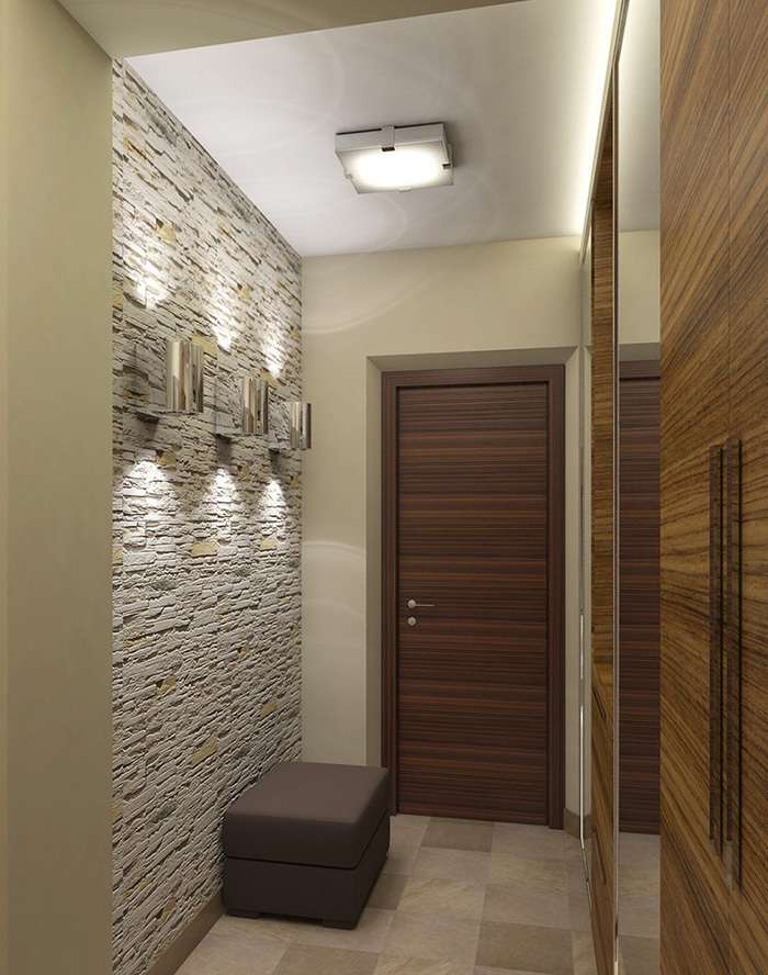 Se usássemos pedra para enfrentar as paredes no corredor, a iluminação deveria estar nas duas paredes. Quando é impossível criar um projeto de iluminação sozinho, você pode recorrer à ajuda de um especialista. Eu não me canso de enfatizar que o sistema de iluminação pode mudar radicalmente o interior e sua percepção.