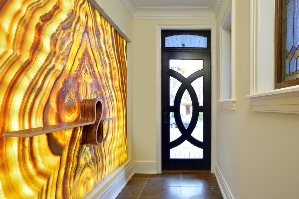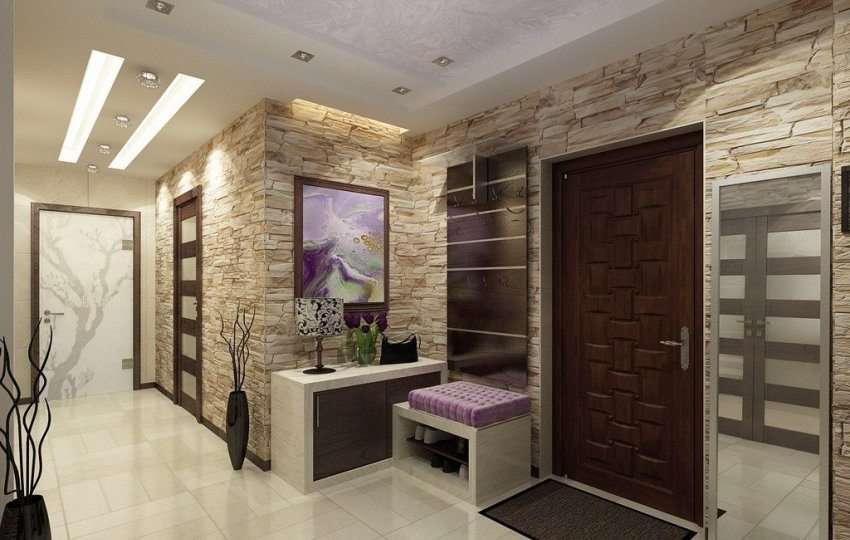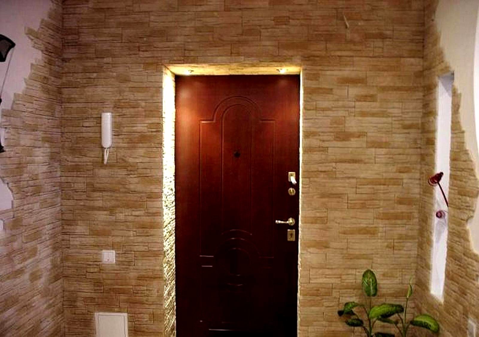 - hall de entrada - decoração de parede. Esta opção indica um status elevado e um senso de gosto dos proprietários do apartamento. Recomenda-se usar para decorar uma ou várias zonas, ou para revet completamente uma das paredes. Dependendo da cor, diferentes efeitos visuais podem ser alcançados: assim, a luz expande visualmente o espaço, enquanto o escuro o absorve;